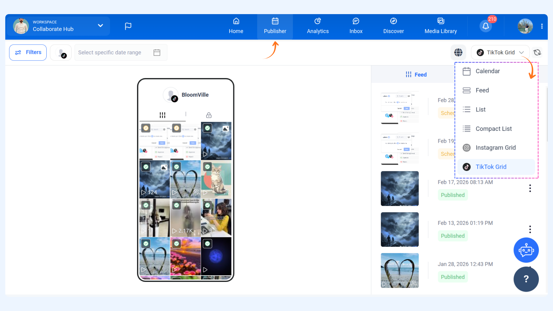 β Grid View displays posts created from both ContentStudio and TikTok native app.