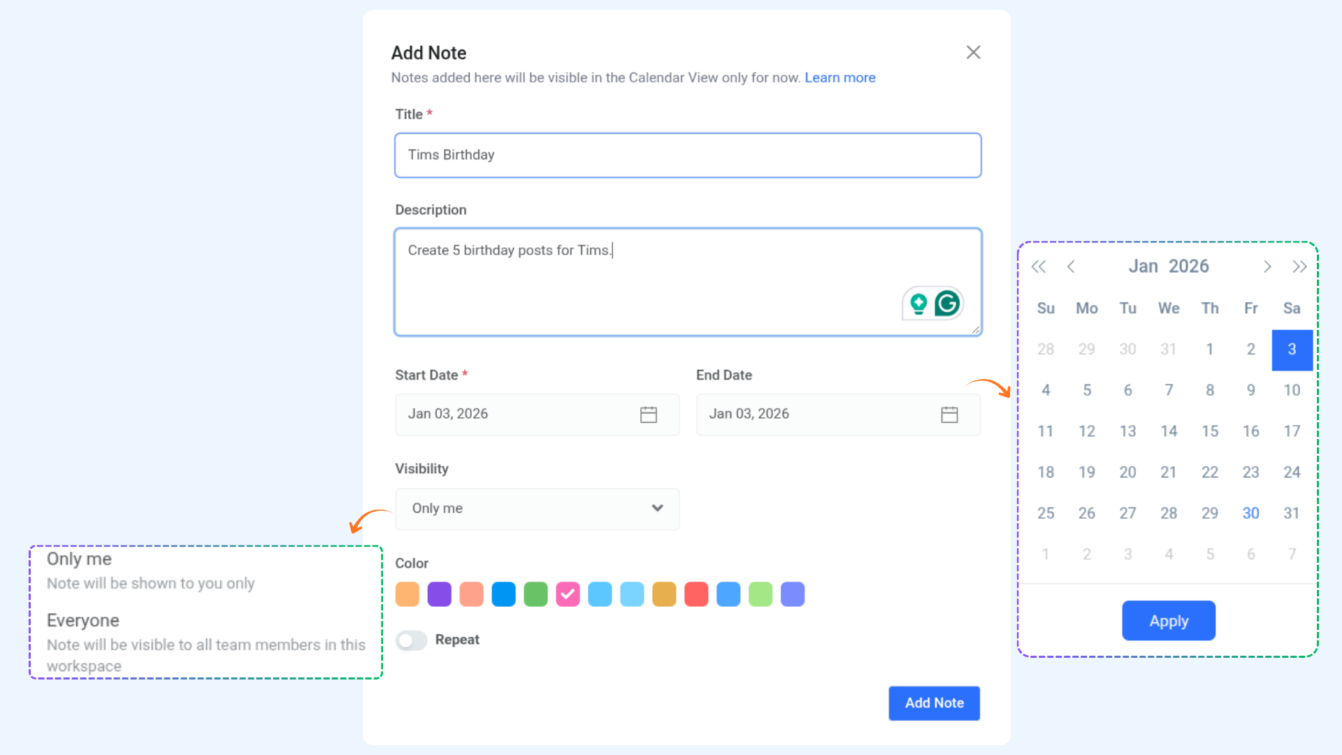 - Date Picker: Select a specific date or a range of dates for the note.