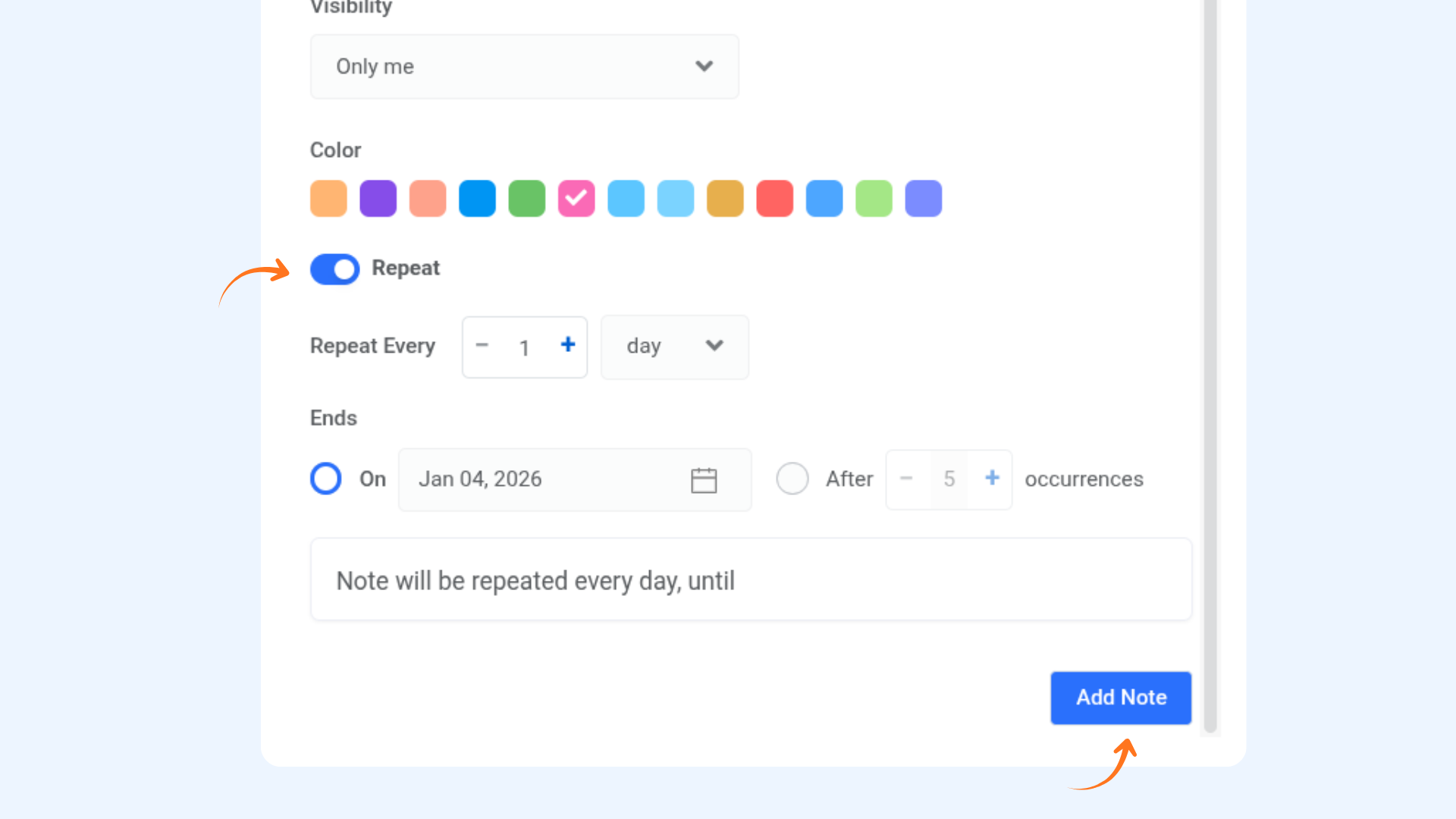 - Enable the Repeat Note toggle to repeat a note by selecting a start and end date or by increasing the occurrence count.