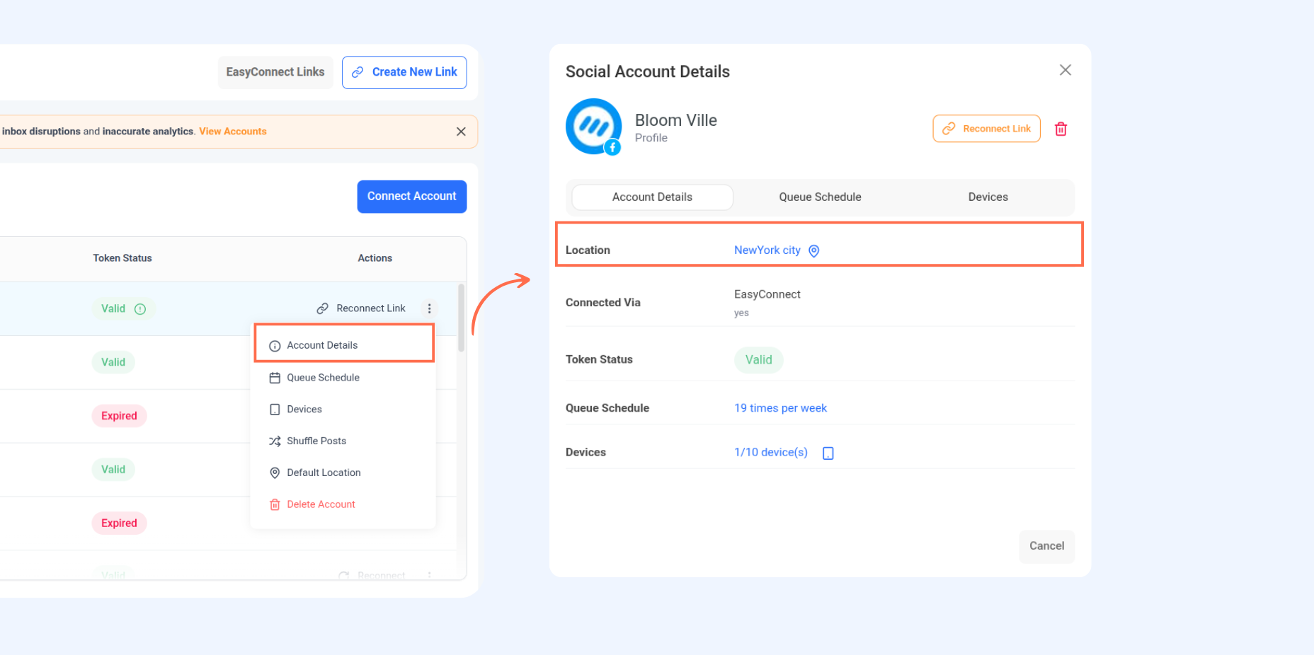 - If you have selected two accounts(Facebook and Instagram), the default locations for all selected accounts will be displayed next to each account's name.