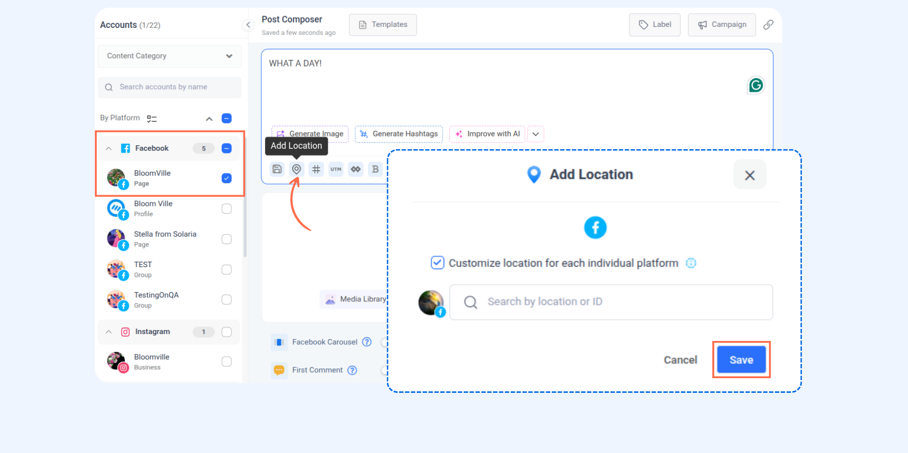ContentStudio introduces seamless location management for Facebook and Instagram. This feature lets you: