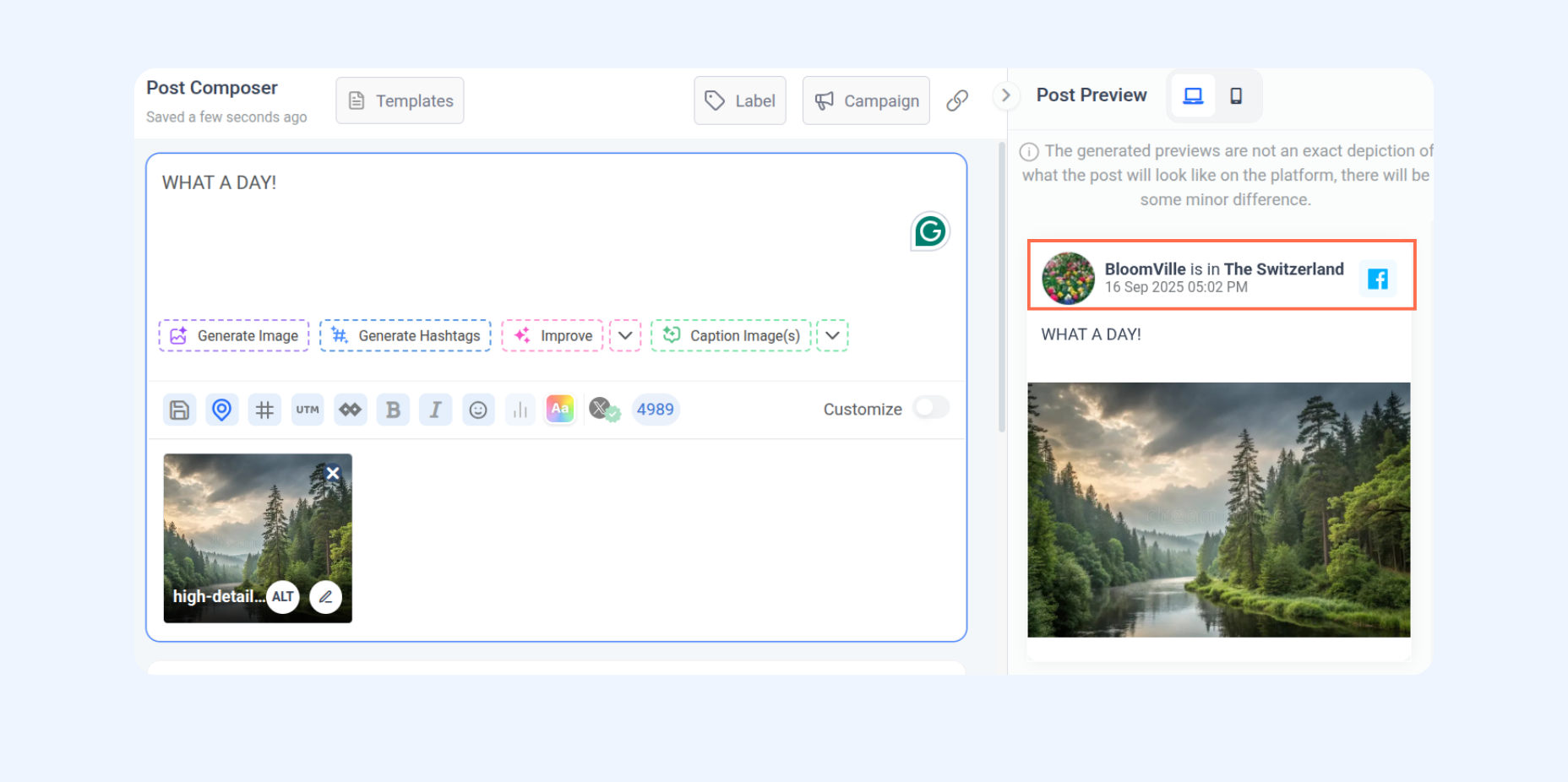 - Choose multiple Facebook and/or Instagram accounts for posting.