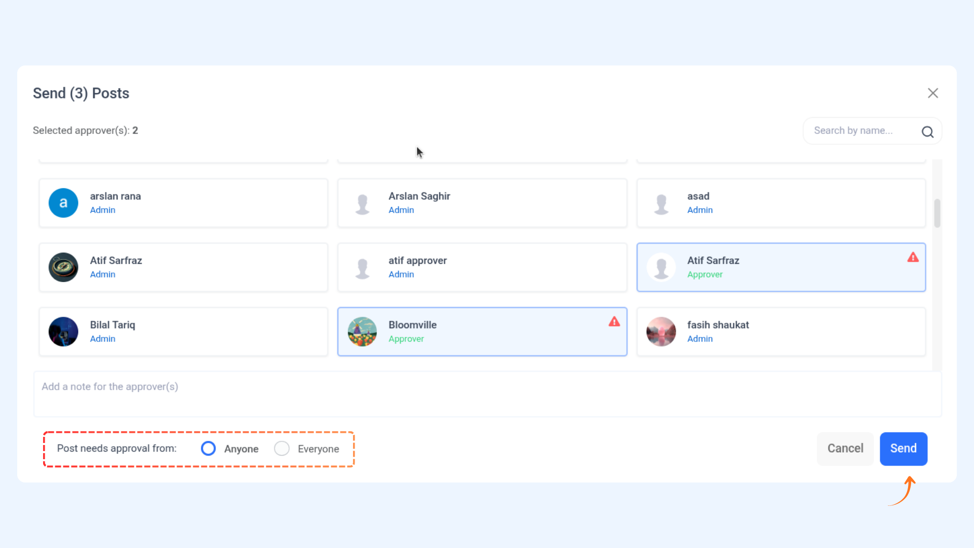 A: For the Anyone condition, only one approval is required. All selected approvers must approve everyone's condition before the post is marked as approved.