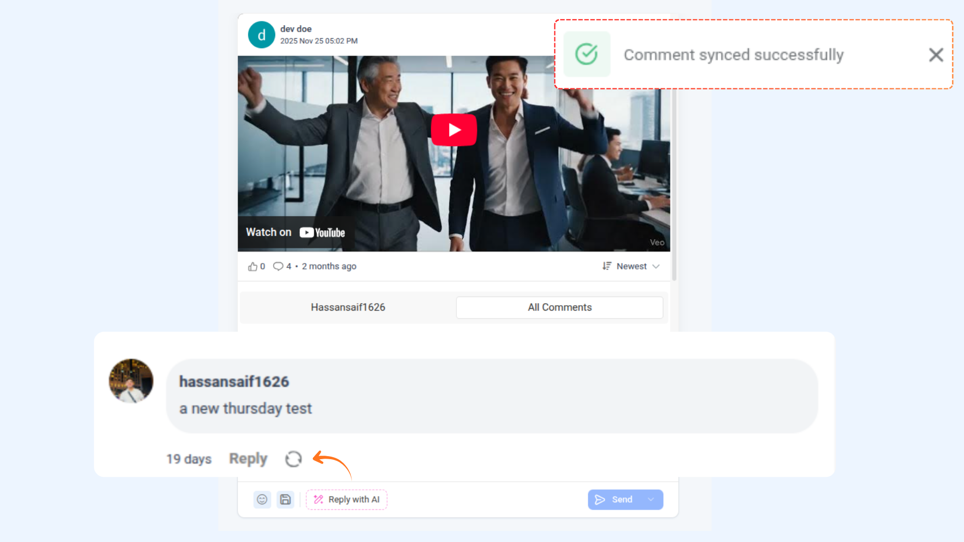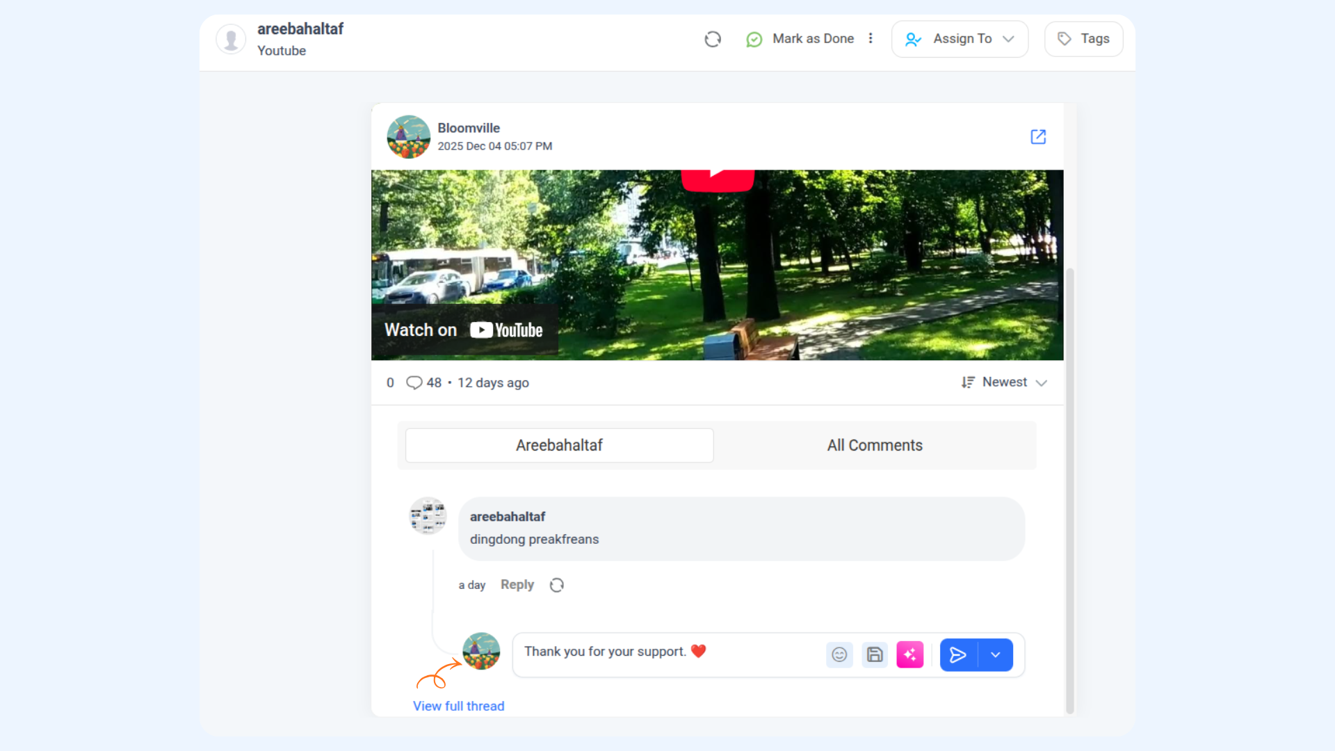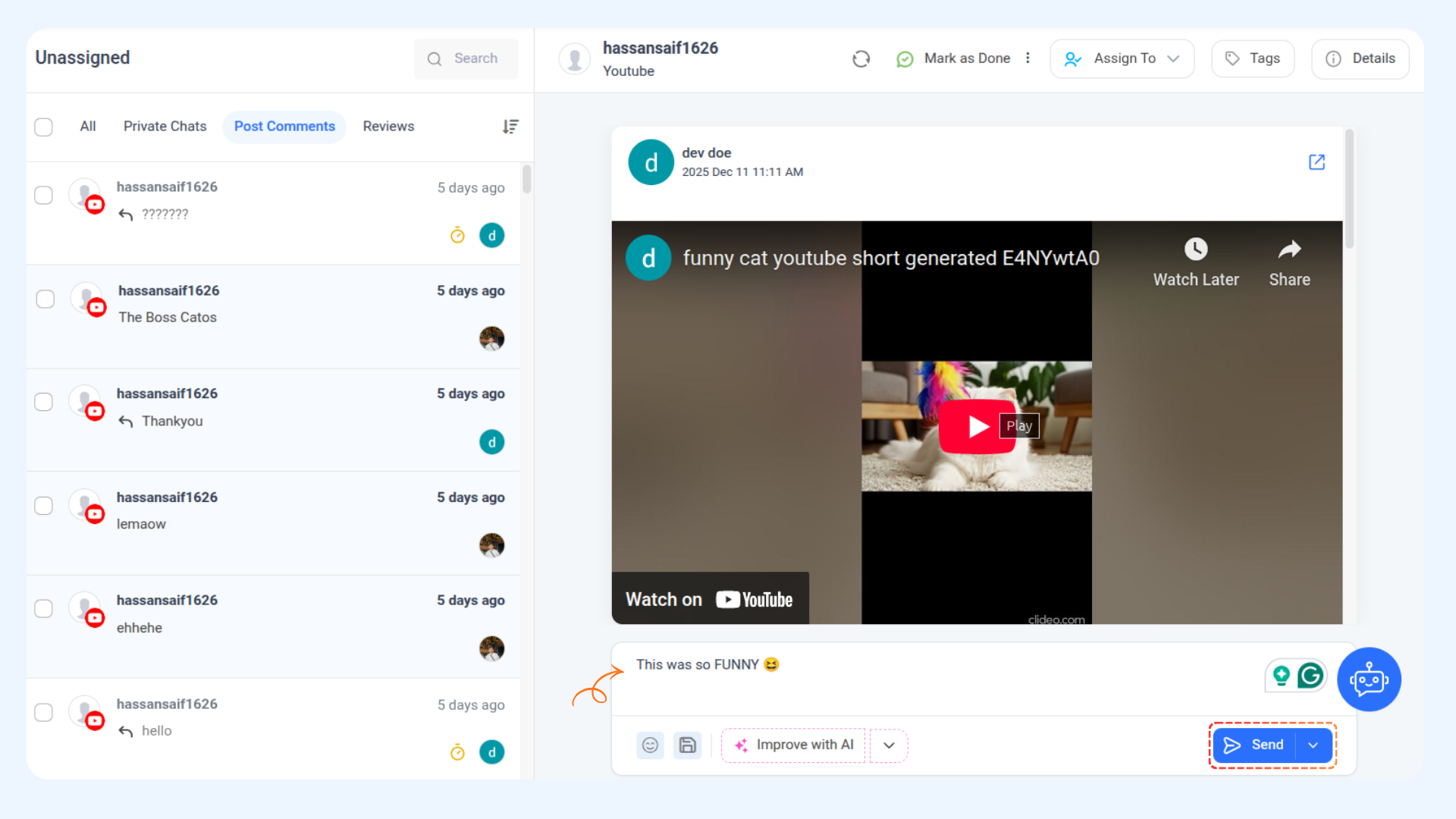 You can also reply to existing comments on YouTube videos from the Inbox. Just type your reply and click Send to respond instantly.