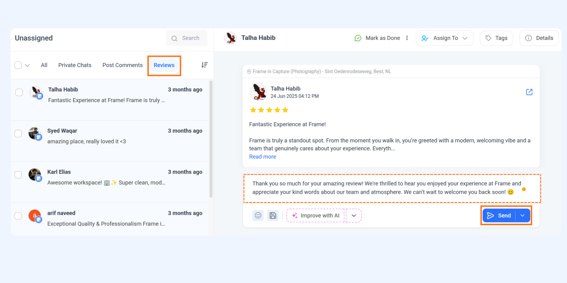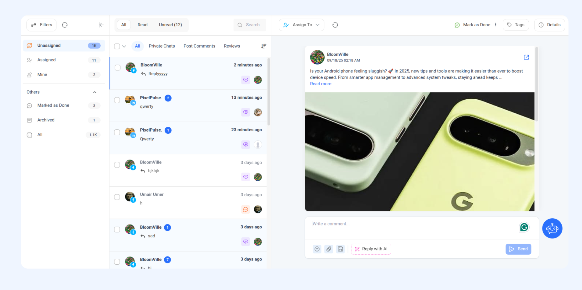 A: LinkedIn only supports post comments, and GMB only supports reviews. Private chats are only for Facebook and Instagram.