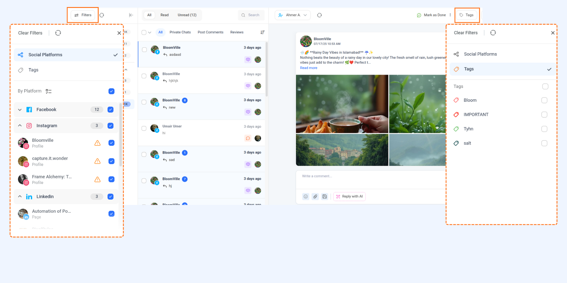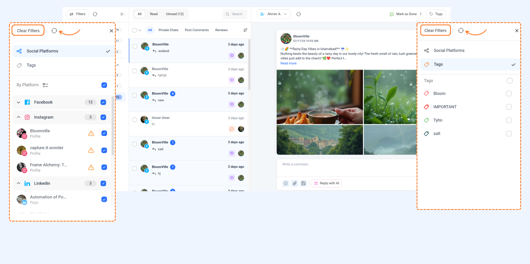 By Platform: When you select a platform like Facebook, a list of connected pages appears. You can check or uncheck individual pages to filter the inbox view.