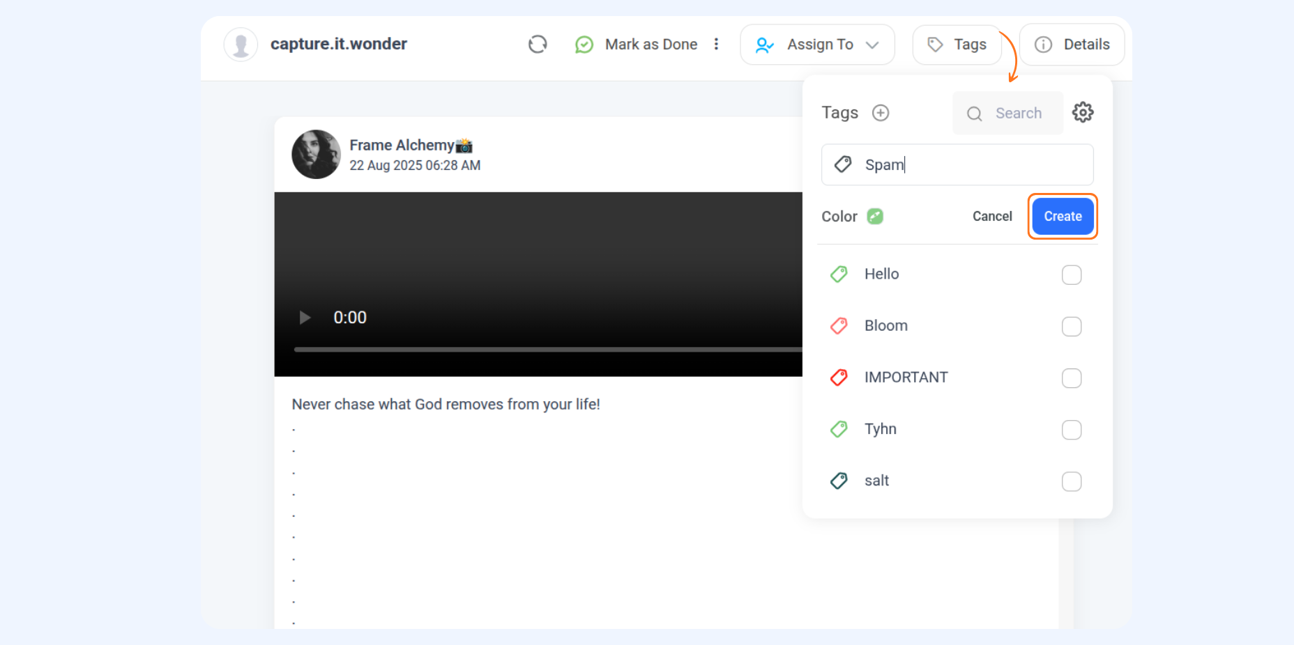 – Choose one or more tags from the existing list, or create a new tag by clicking the + icon and then Create.