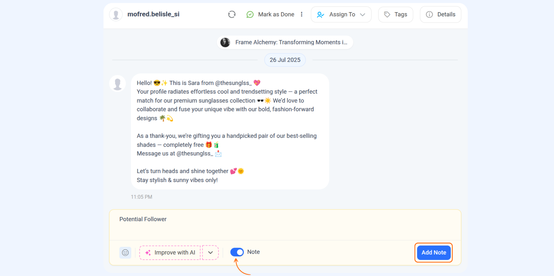 You can add notes about the person or interaction only visible to your team (not the customer).