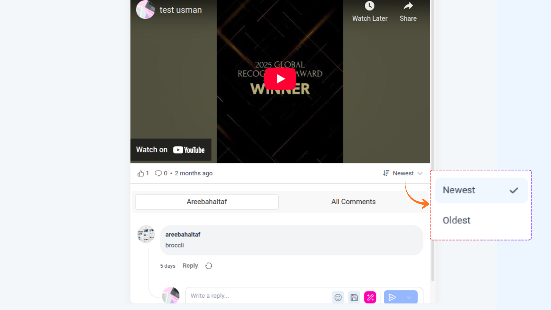 You can filter YouTube comments in the Inbox by Newest or Oldest, making it easier to prioritize recent interactions or review earlier conversations.