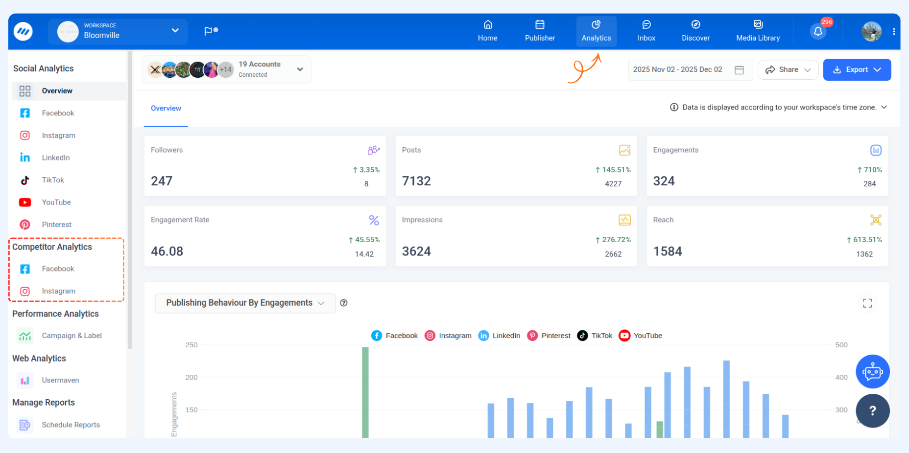 A: The export feature is available for Facebook and Instagram reports under the Competitor Analytics section.