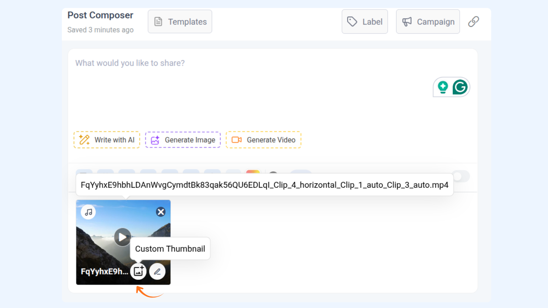 A custom thumbnail is a still image selected manually to represent your video post. Instead of letting platforms auto-generate one, you can pick a frame from your video or upload a separate image for more control and brand consistency.