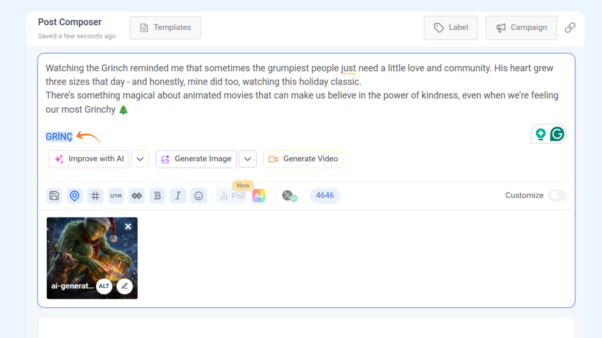 Caption tagging allows you to mention public pages or company profiles directly in your post’s text. When published, the mention becomes a clickable link that leads to the tagged page’s profile on the respective platform.