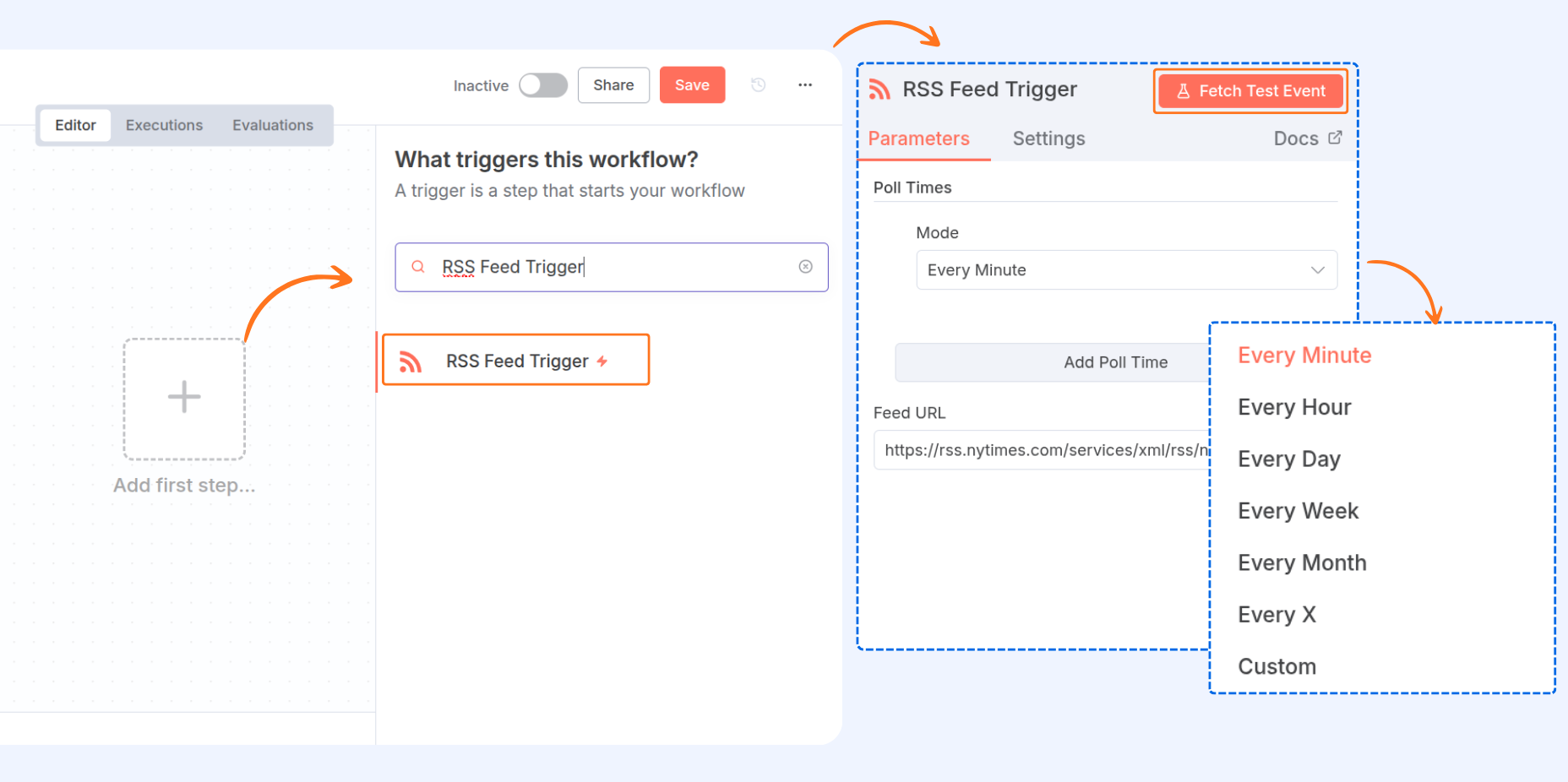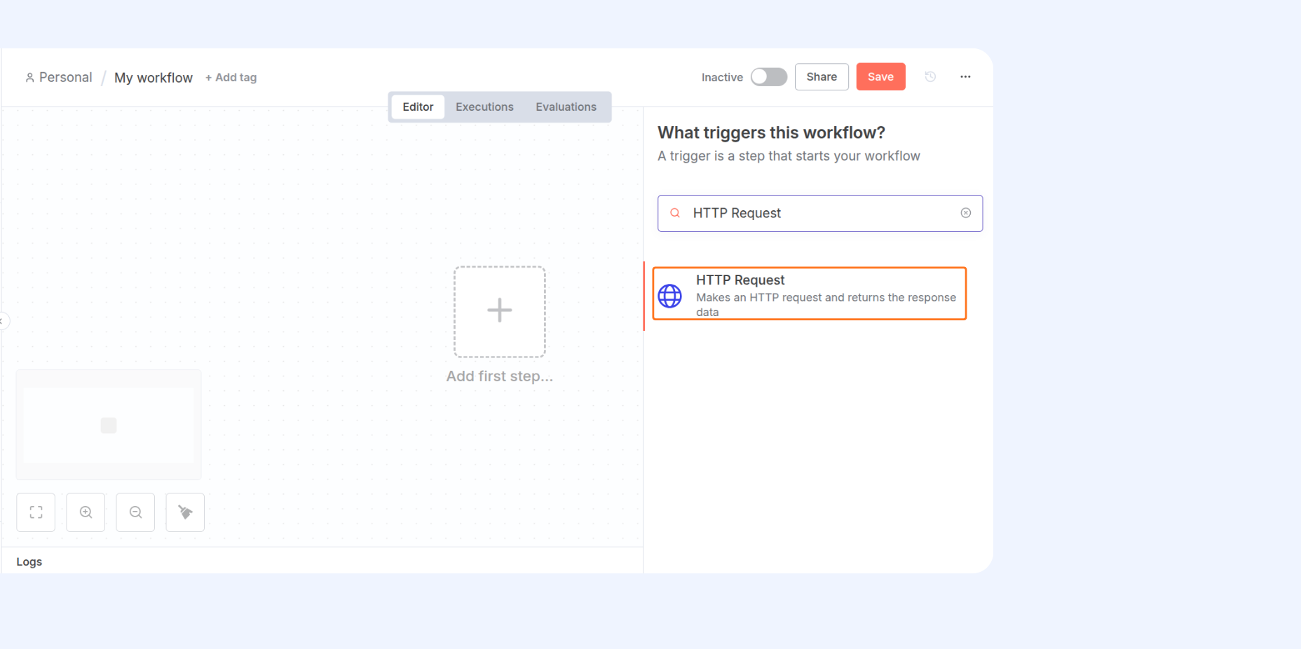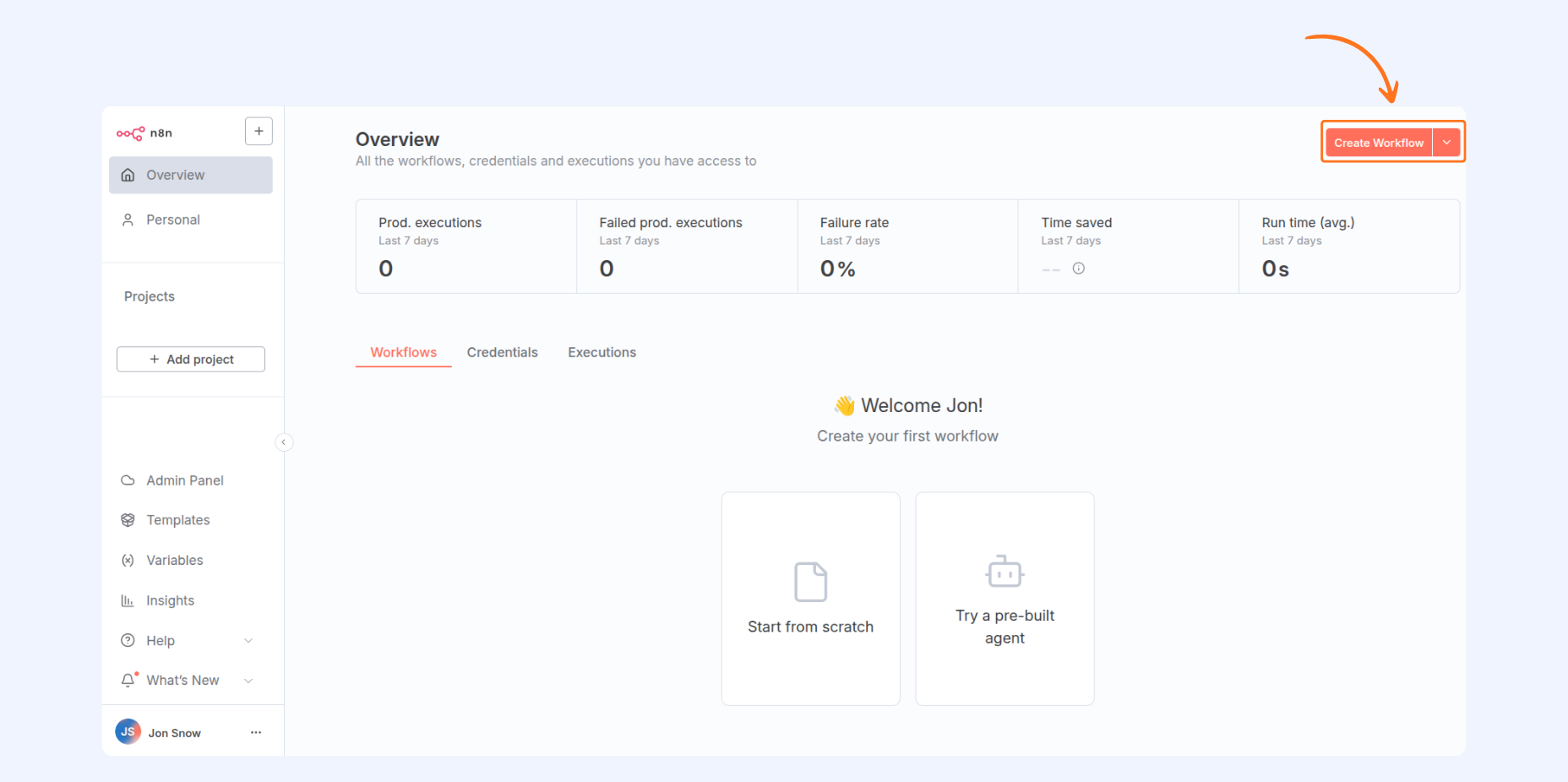 Click Create Workflow from your n8n dashboard to start building your automation.