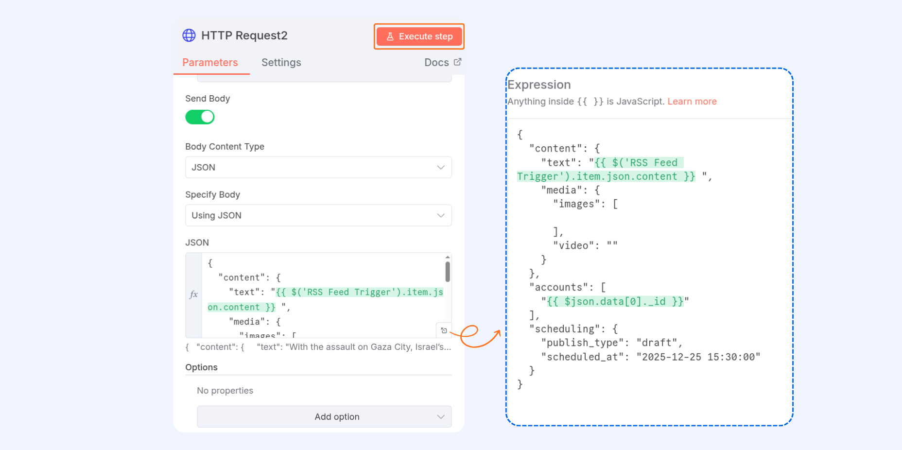 from the API guide under Posts → Create a new social media post, or fill the fields manually.