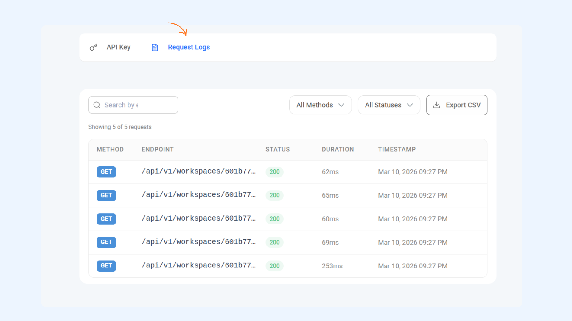 4 Once filters are applied, click the Export CSV button to download your API request logs.