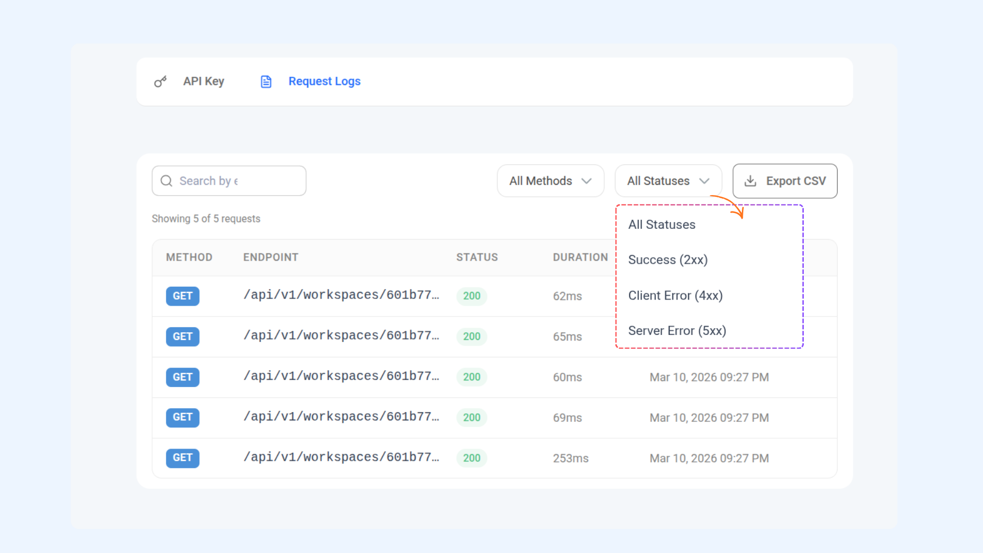 3 Use the Statuses dropdown to filter requests by Success (2xx), Client Error (4xx), or Server Error (5xx).