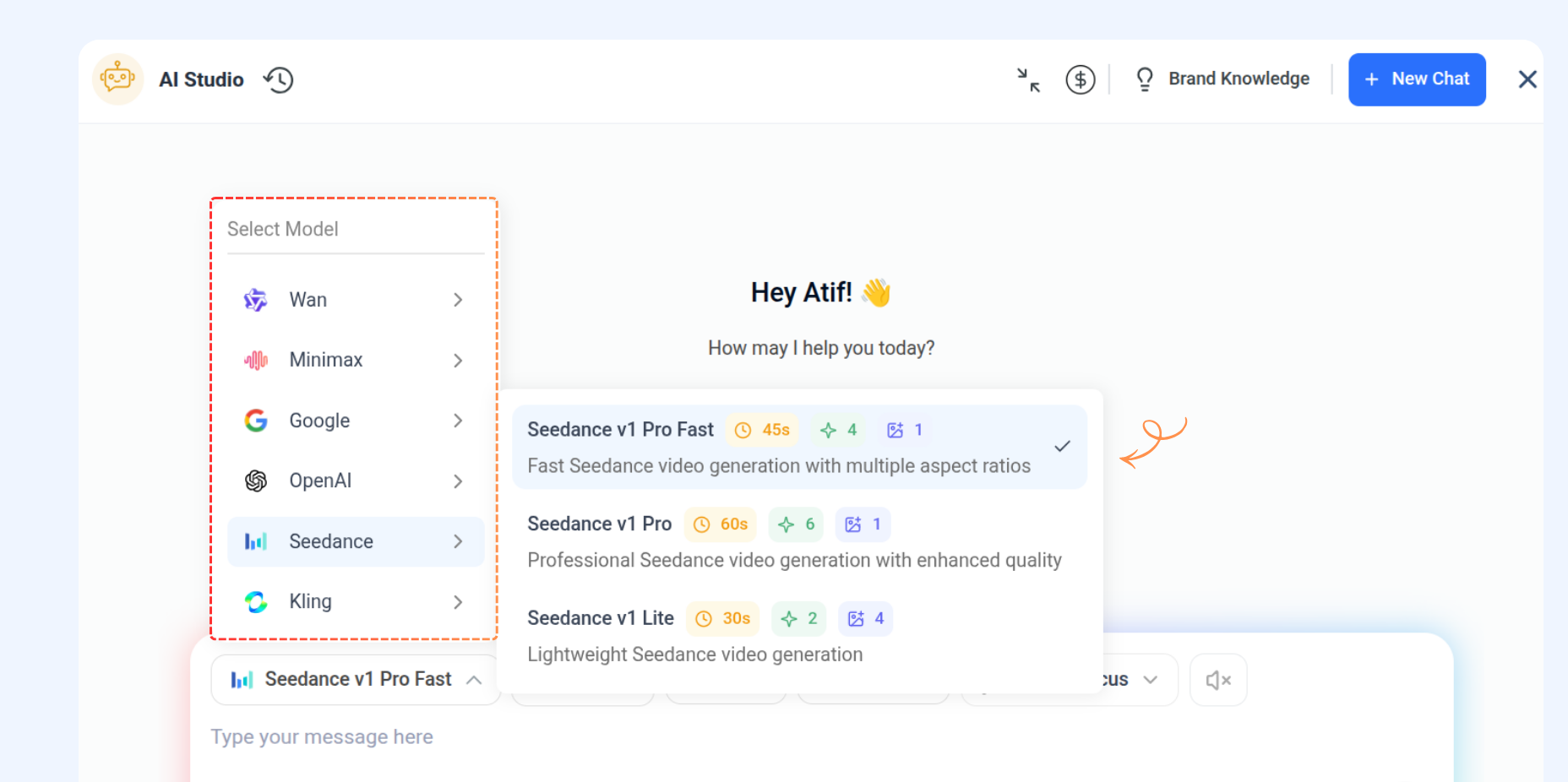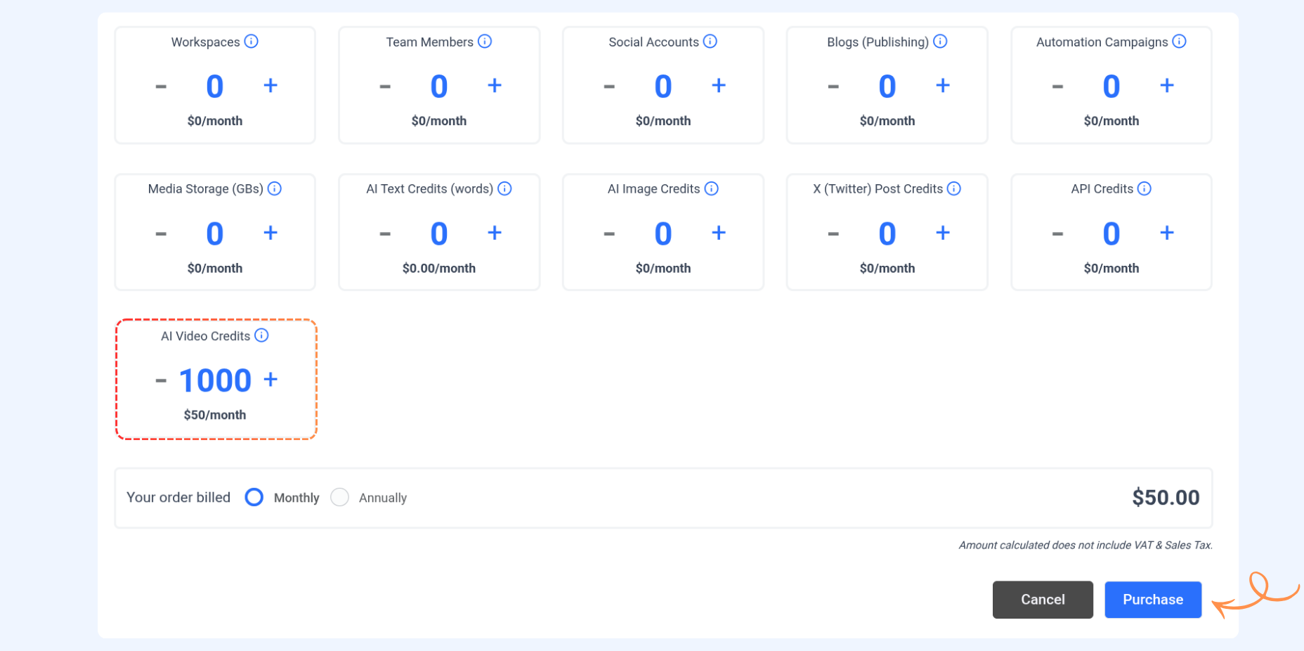 - Select AI Video Credits, choose the quantity you want, and complete your purchase