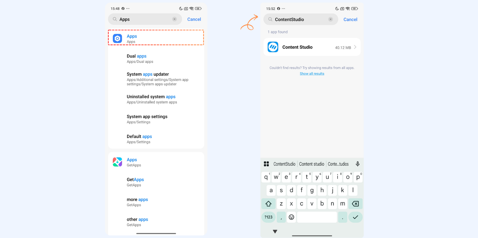Within the Apps list, locate ContentStudio. You can either scroll through your apps or use the search bar at the top to find it quickly.