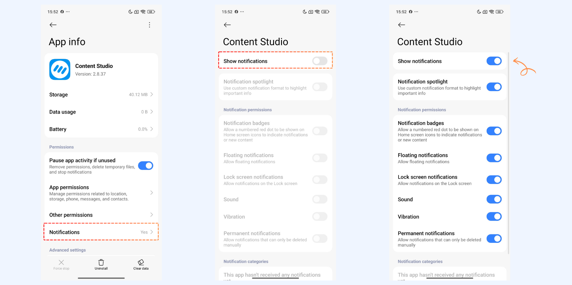 A1: Ensure that notifications are enabled for ContentStudio in your Android settings. Also, check that Do Not Disturb mode is turned off and that the app has permission to send notifications.
