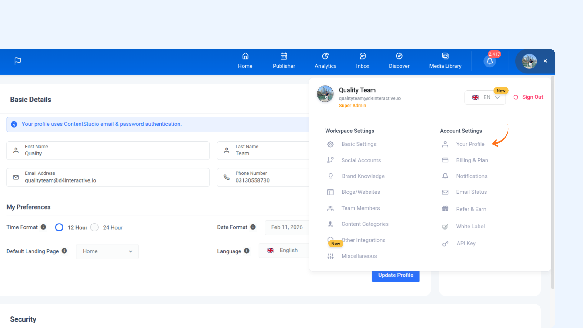 If the email already exists in the system, or if the super admin wants to transfer super admin rights to another user or team member, these actions require assistance from our Customer Support (support@contentstudio.io) team. This ensures: