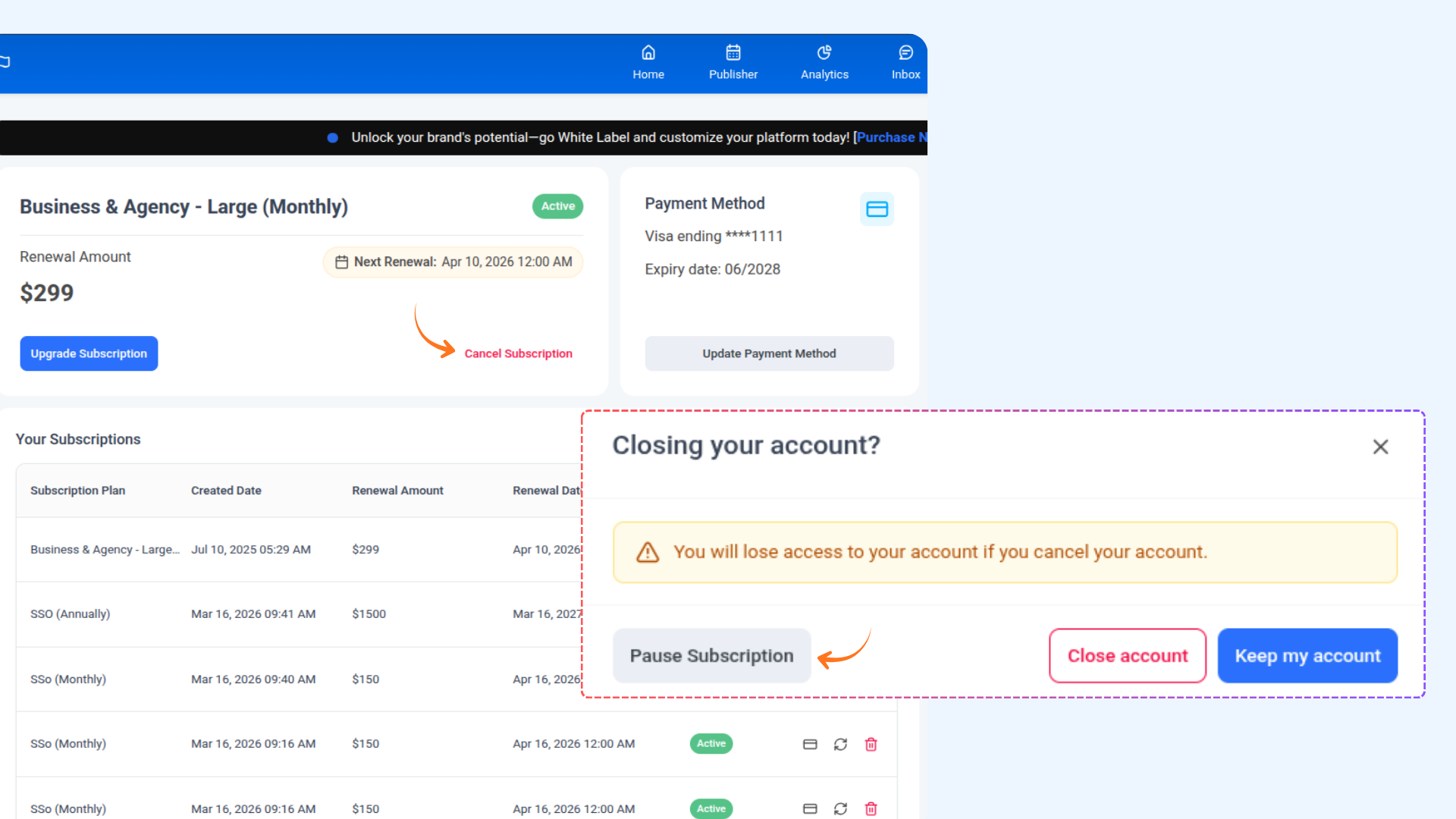 ContentStudio’s billing and subscription settings follow a role-based access structure to ensure secure account management.