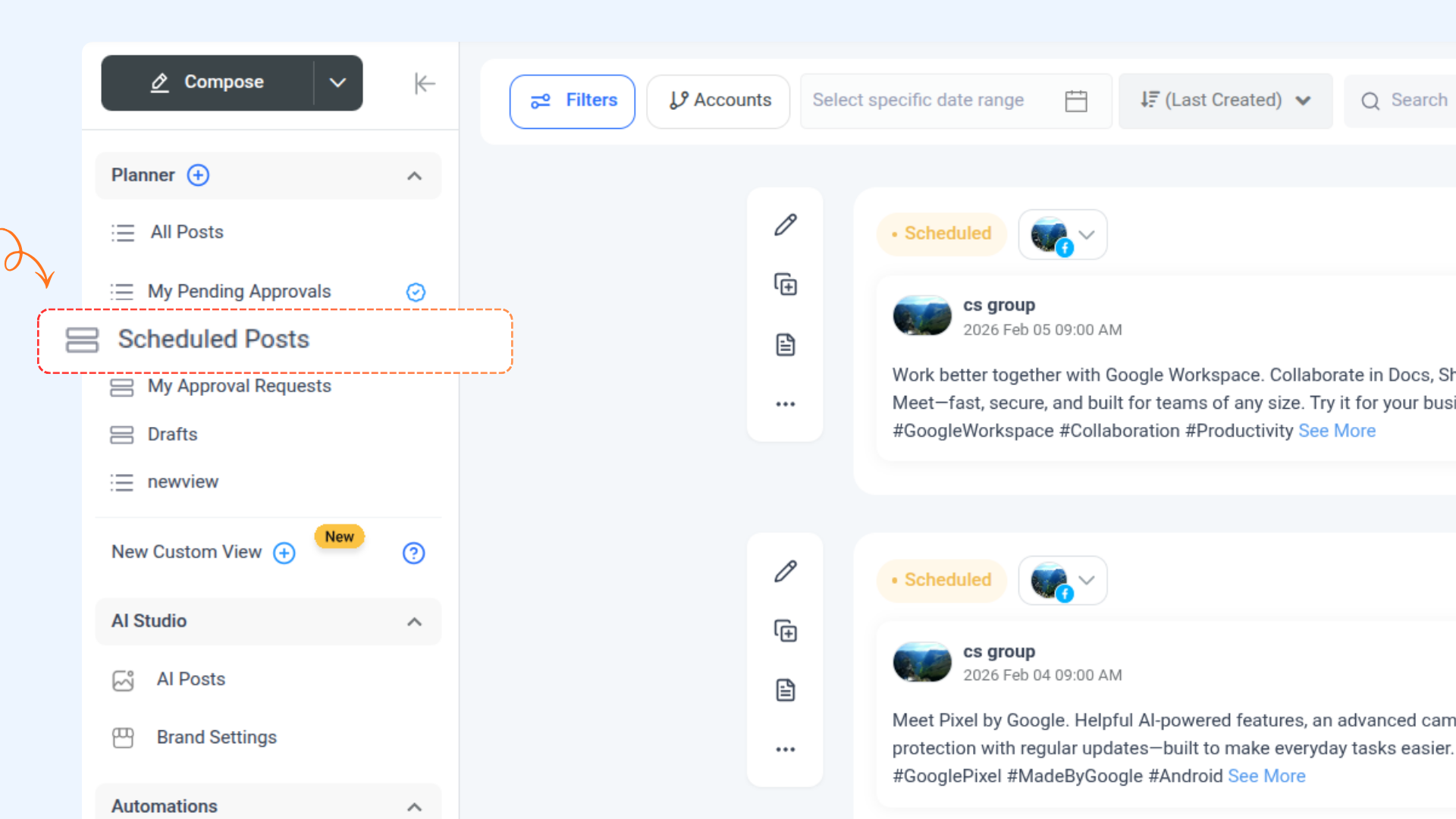 The Scheduled view displays all posts that are scheduled to be published in the future, helping you track upcoming content across your connected accounts.