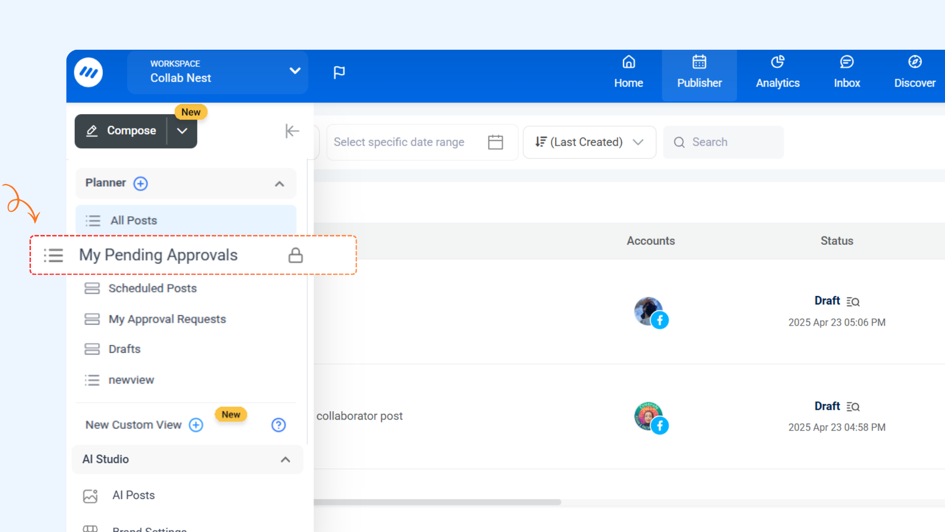 The My Pending Approvals view shows posts that are awaiting your approval, allowing you to quickly review and take action on assigned content.