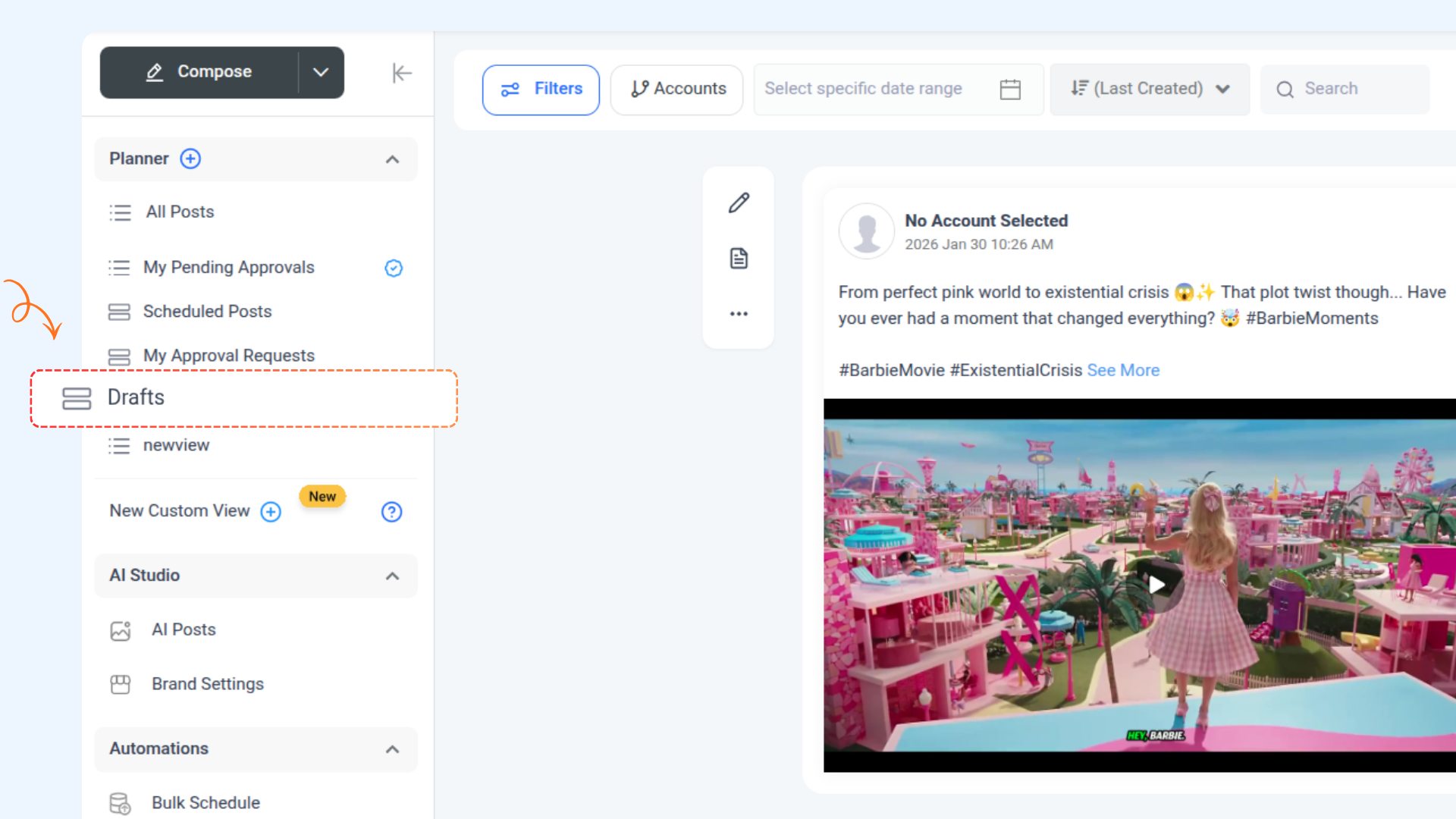 The Drafts view shows all posts that are saved as drafts but not yet scheduled or published, making it easy to continue working on unfinished content.