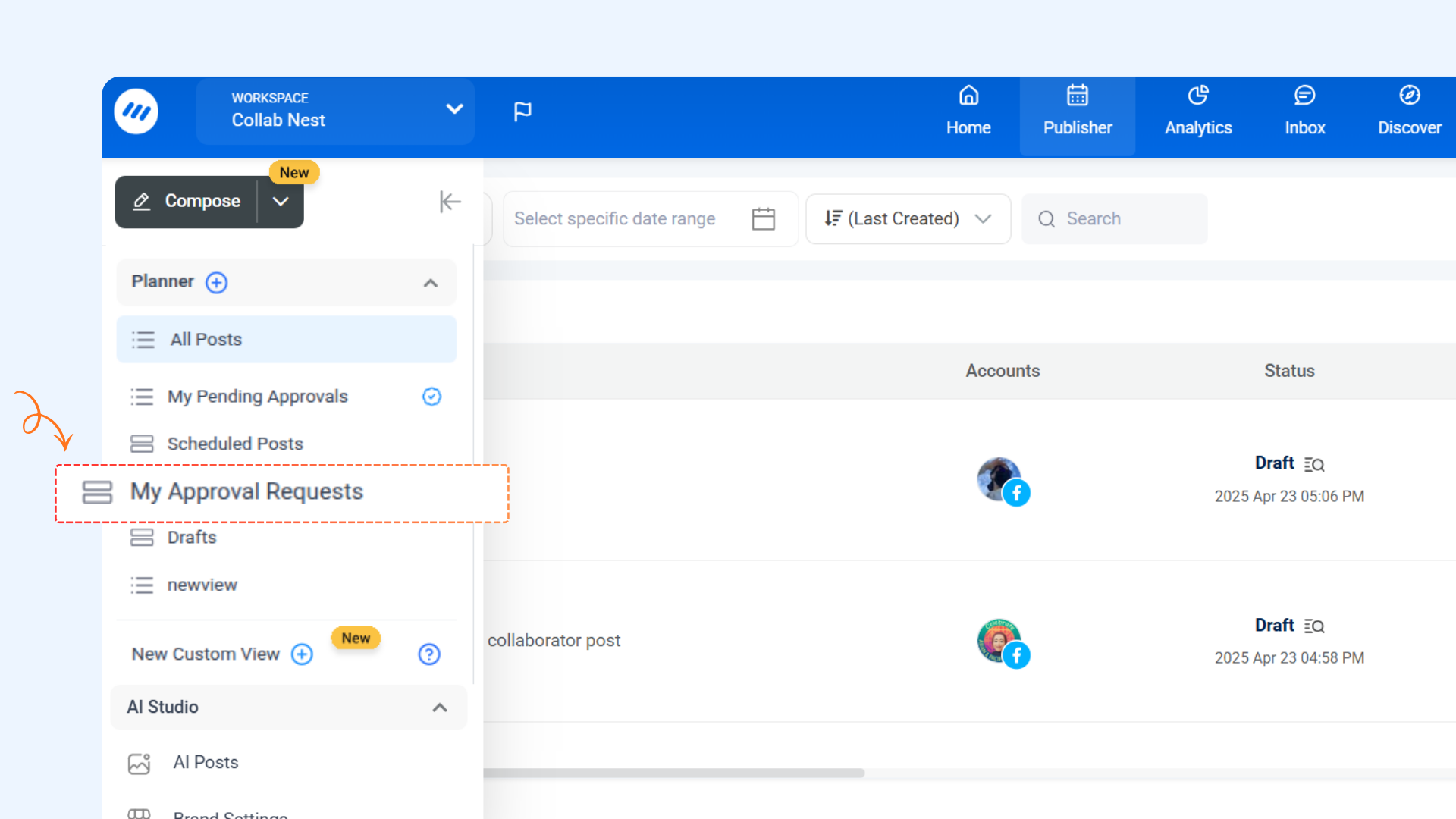 The My Approval Requests view displays posts you have submitted for approval, helping you track their approval status in one place.