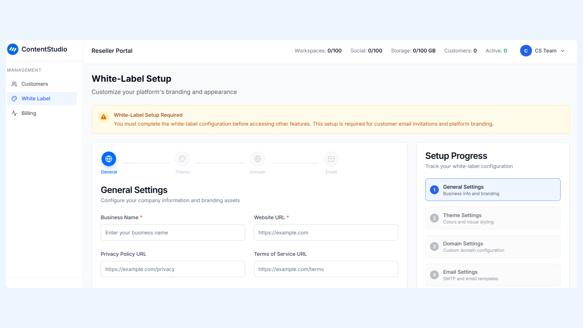 If white-label setup is not completed, customer invitations cannot be sent and branding, domain, and email configuration remain inactive. Other dashboard features may also remain inaccessible, depending on configuration.