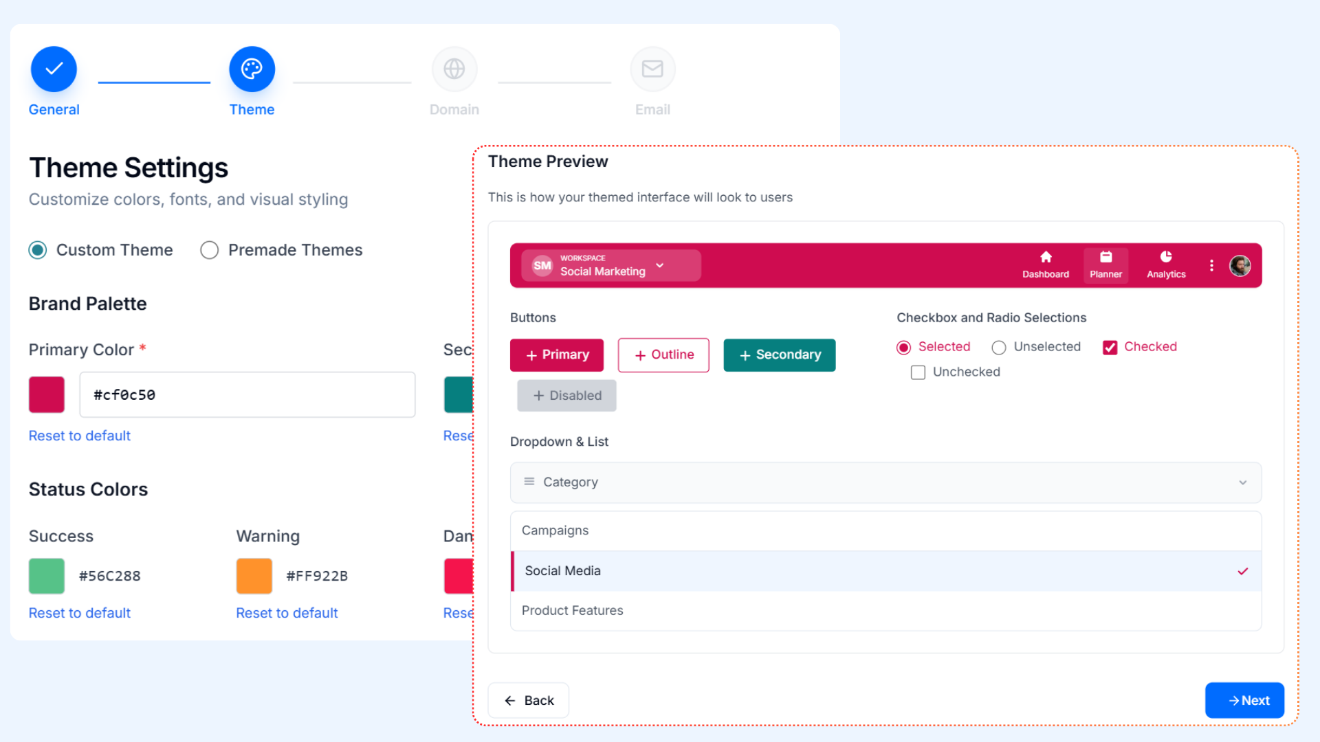 Theme Settings allow you to control the visual appearance of the platform. You can: