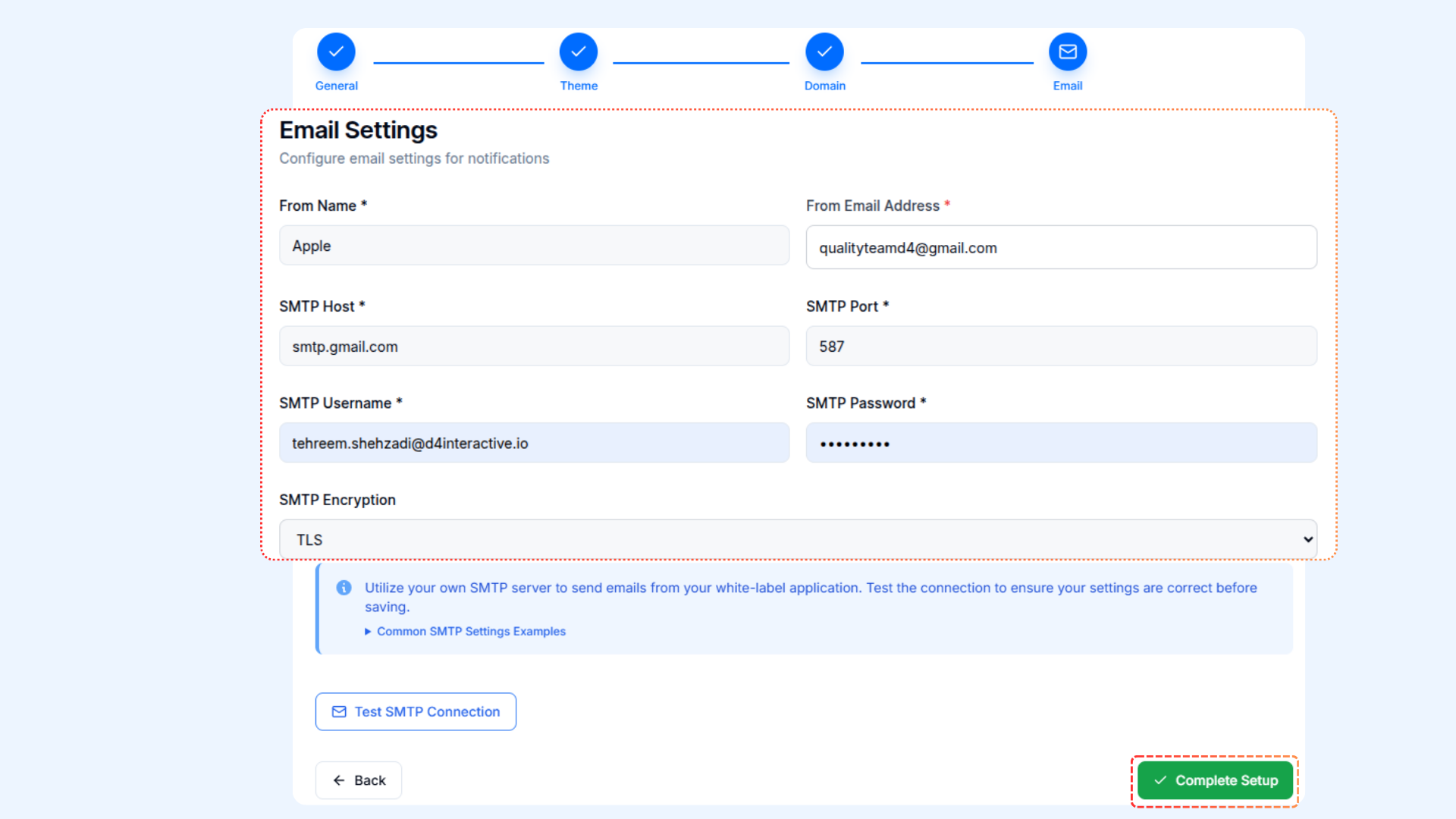 After entering all the details, save your configuration to enable email functionality for your branded platform.