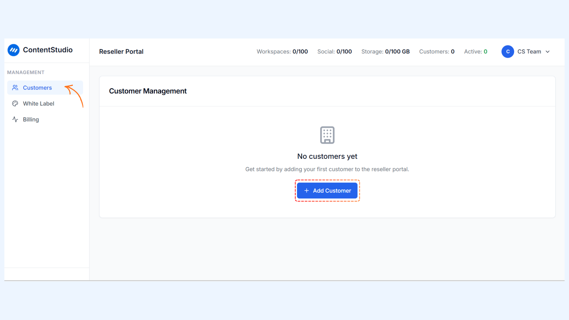 After completing the White Label Setup, resellers can begin adding customers from the Customers section in the left-hand navigation.
