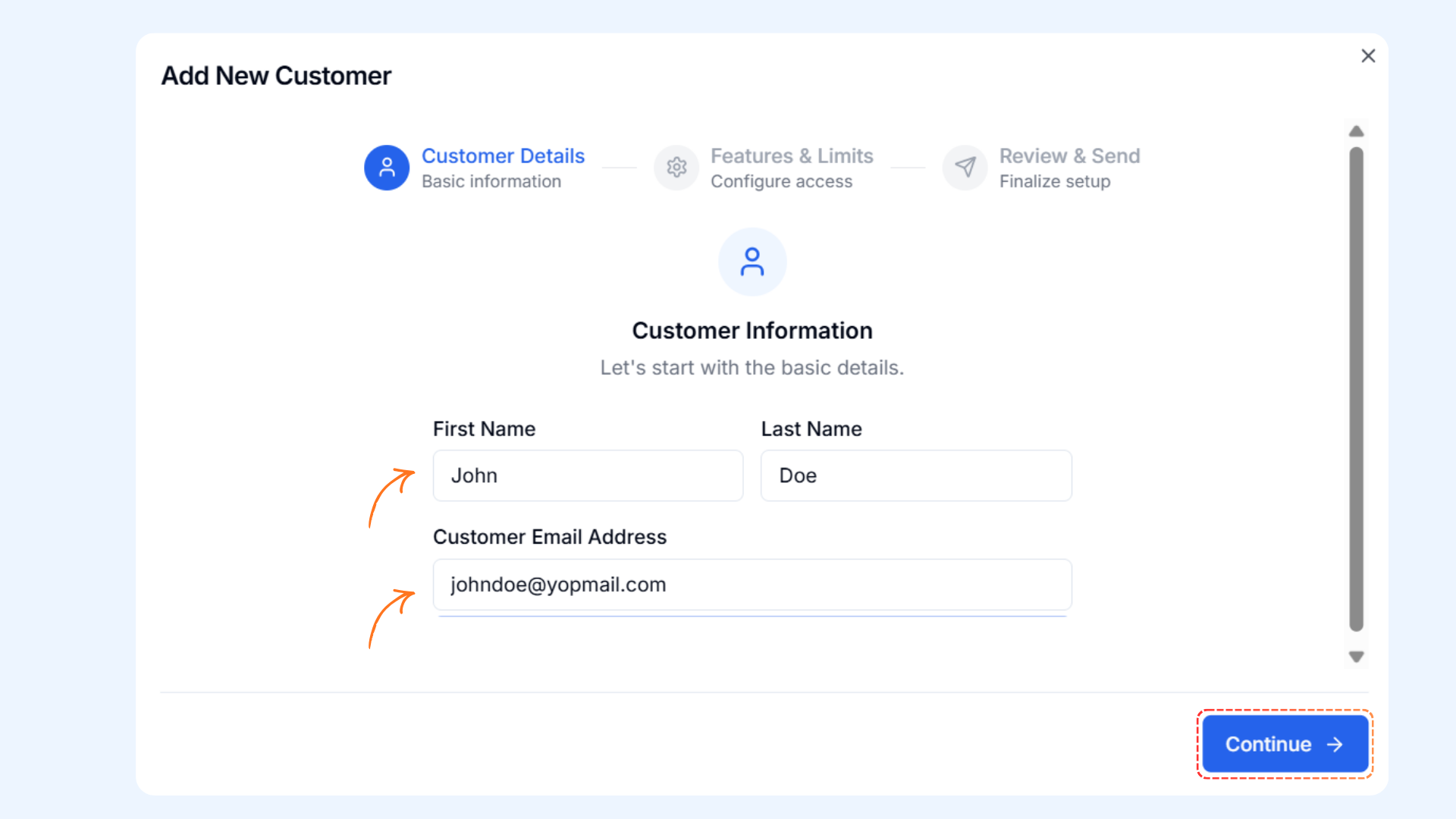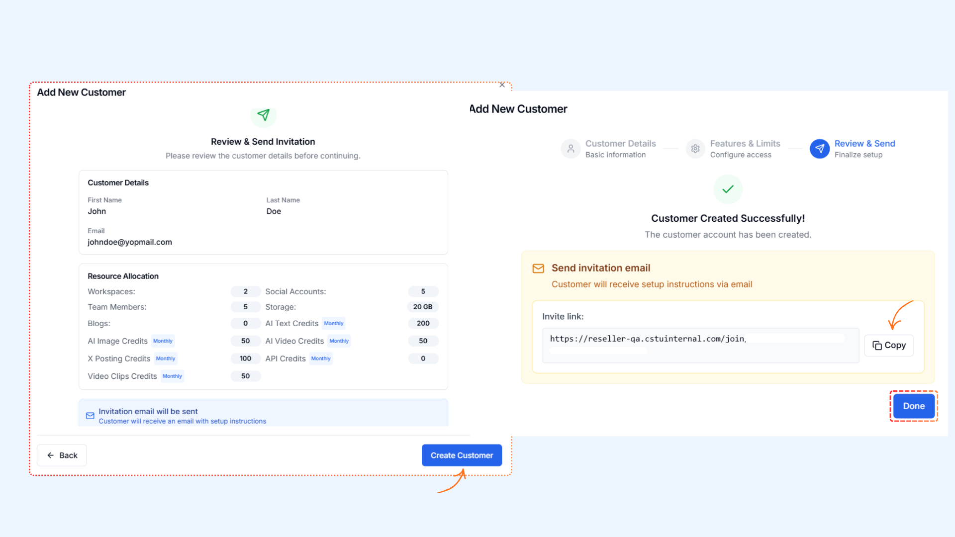 In the Review & Send Invitation section, review all the customer details and click Create Customer.