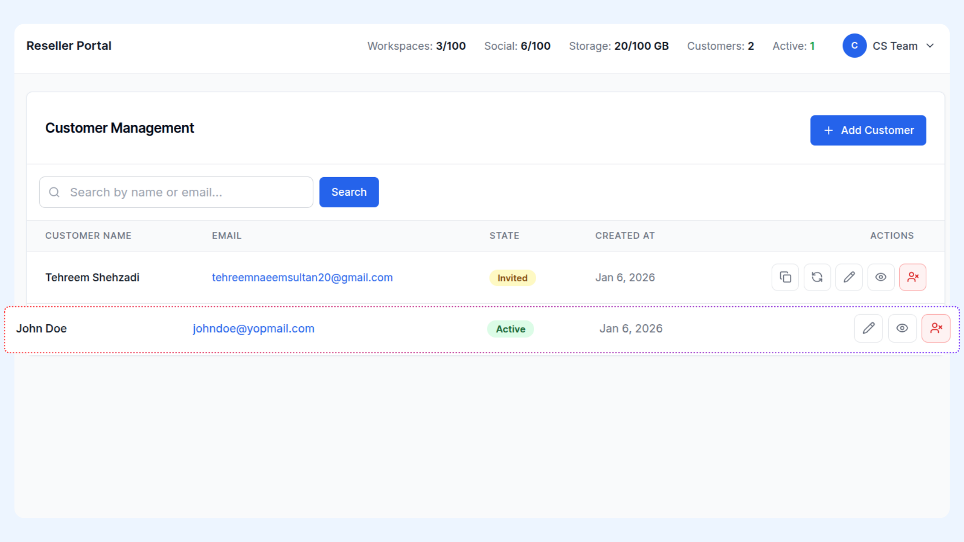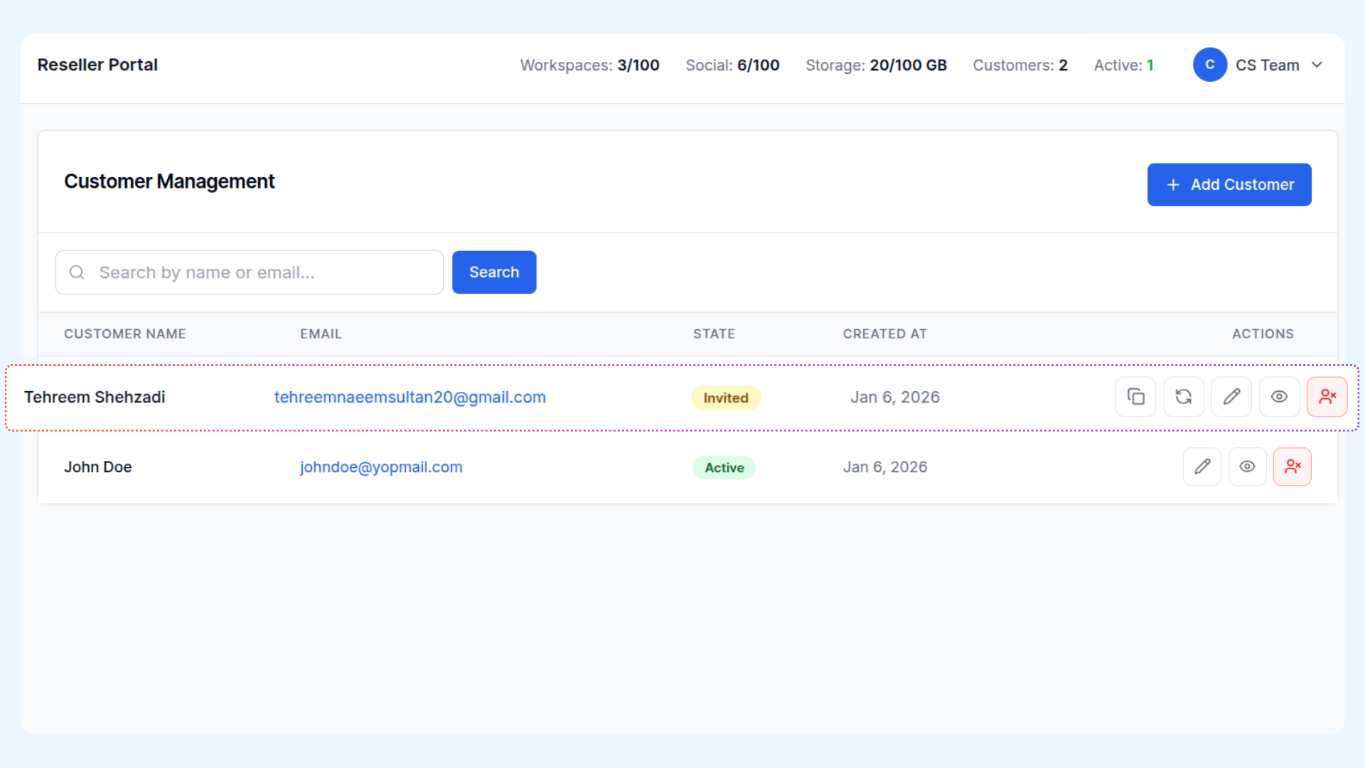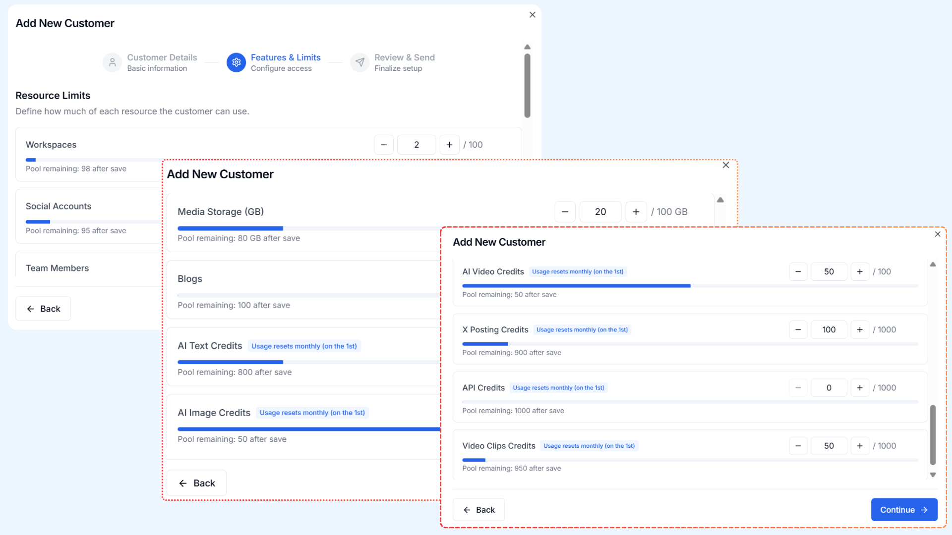 Beyond branding, the Reseller Dashboard serves as a centralized control center for managing customer accounts. Resellers can allocate social accounts, workspaces, team members, storage, and credit limits based on individual customer agreements — all from a single, dedicated dashboard.
