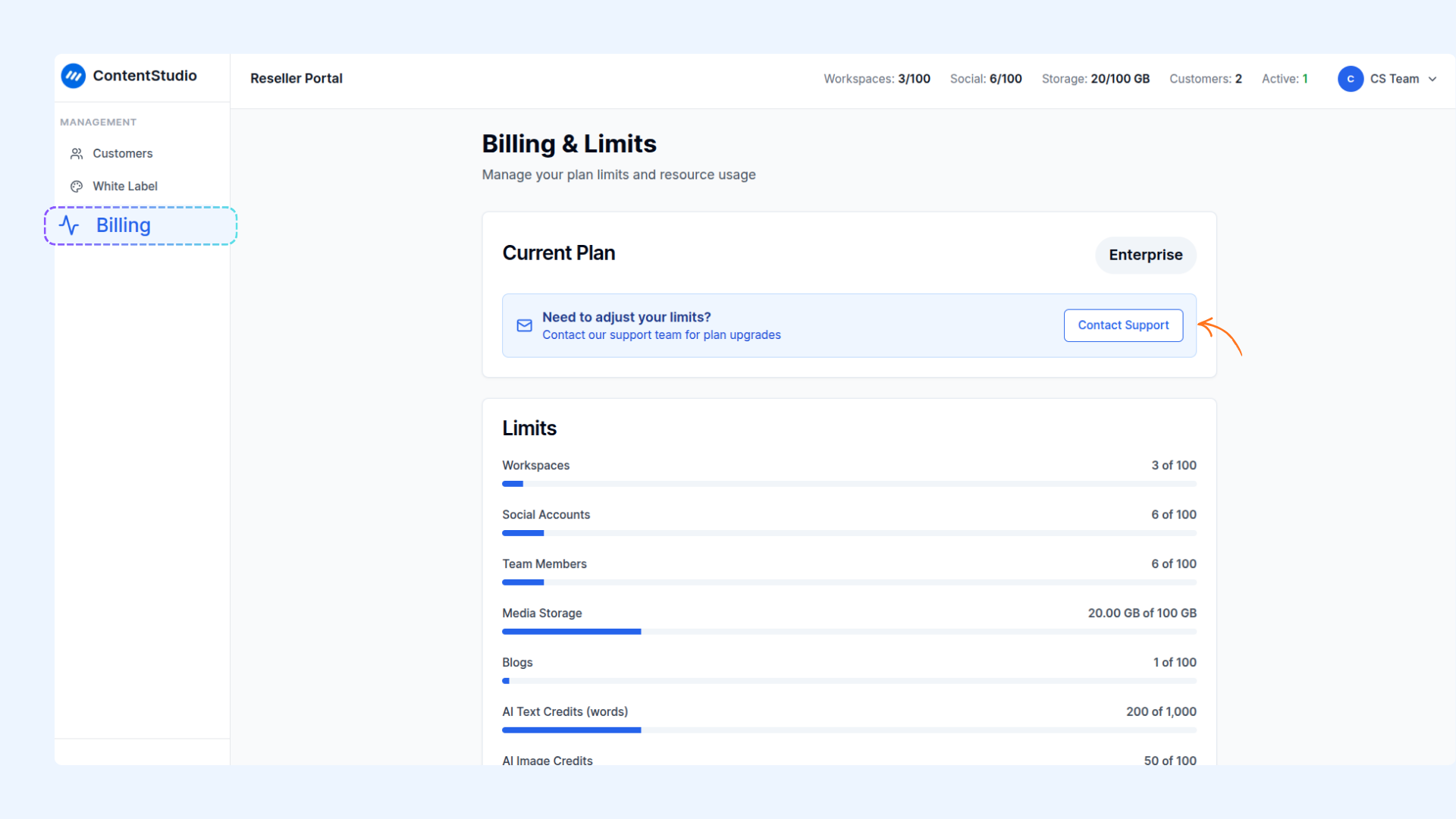 - For plan upgrades, billing changes, or payment-related queries, the reseller can contact the ContentStudio support or billing team.