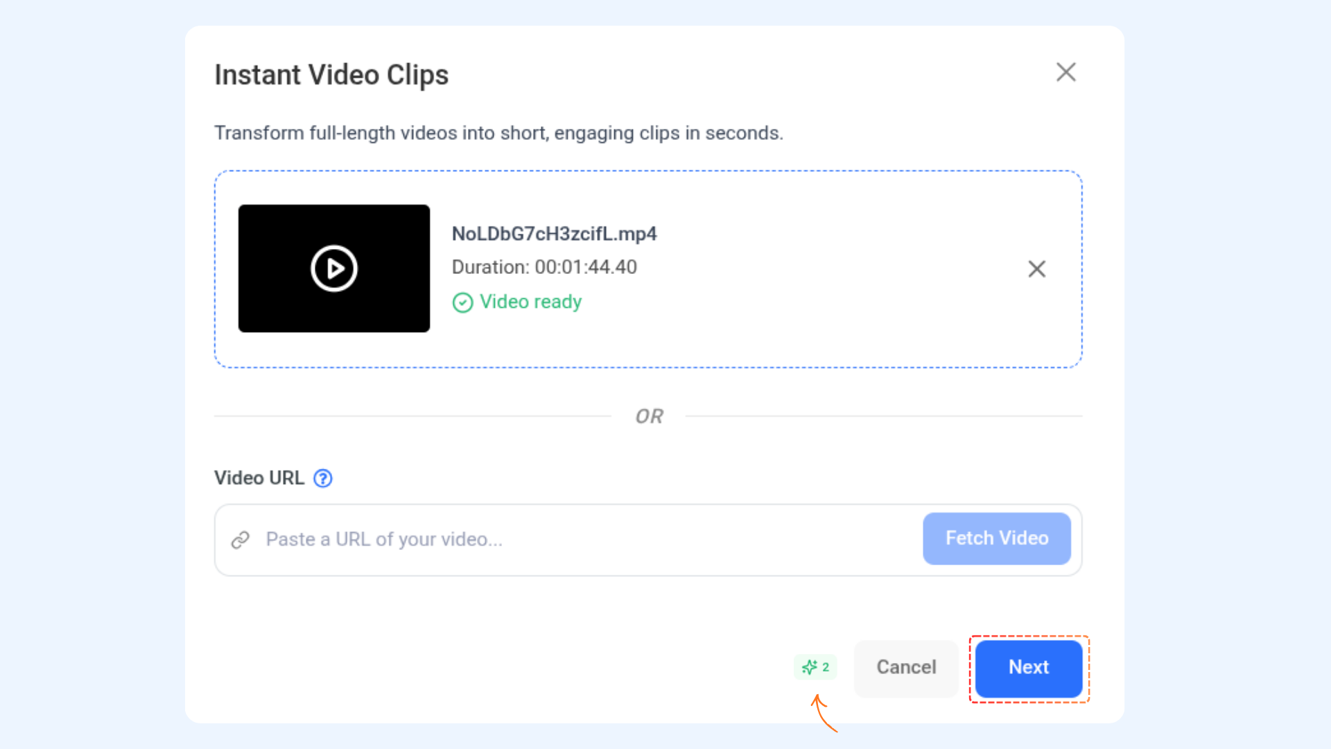 Upload the video you want to convert into short clips. You can: