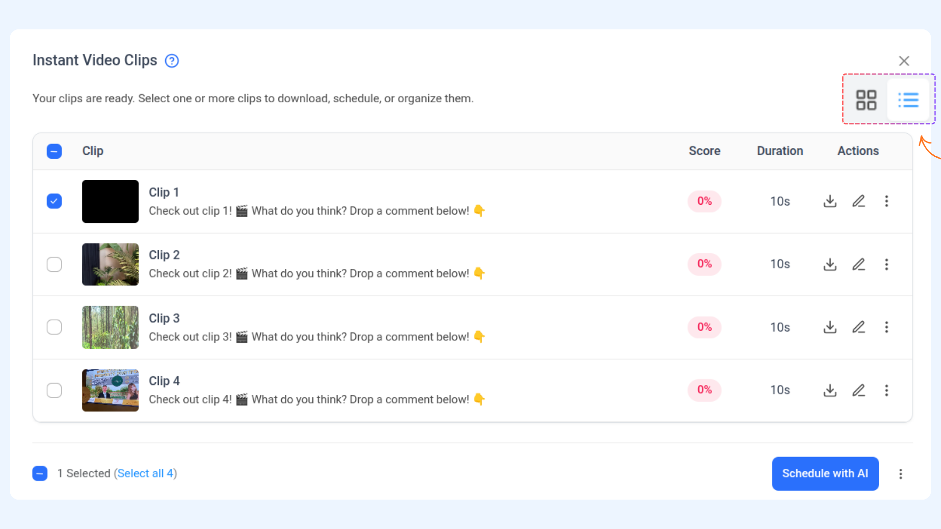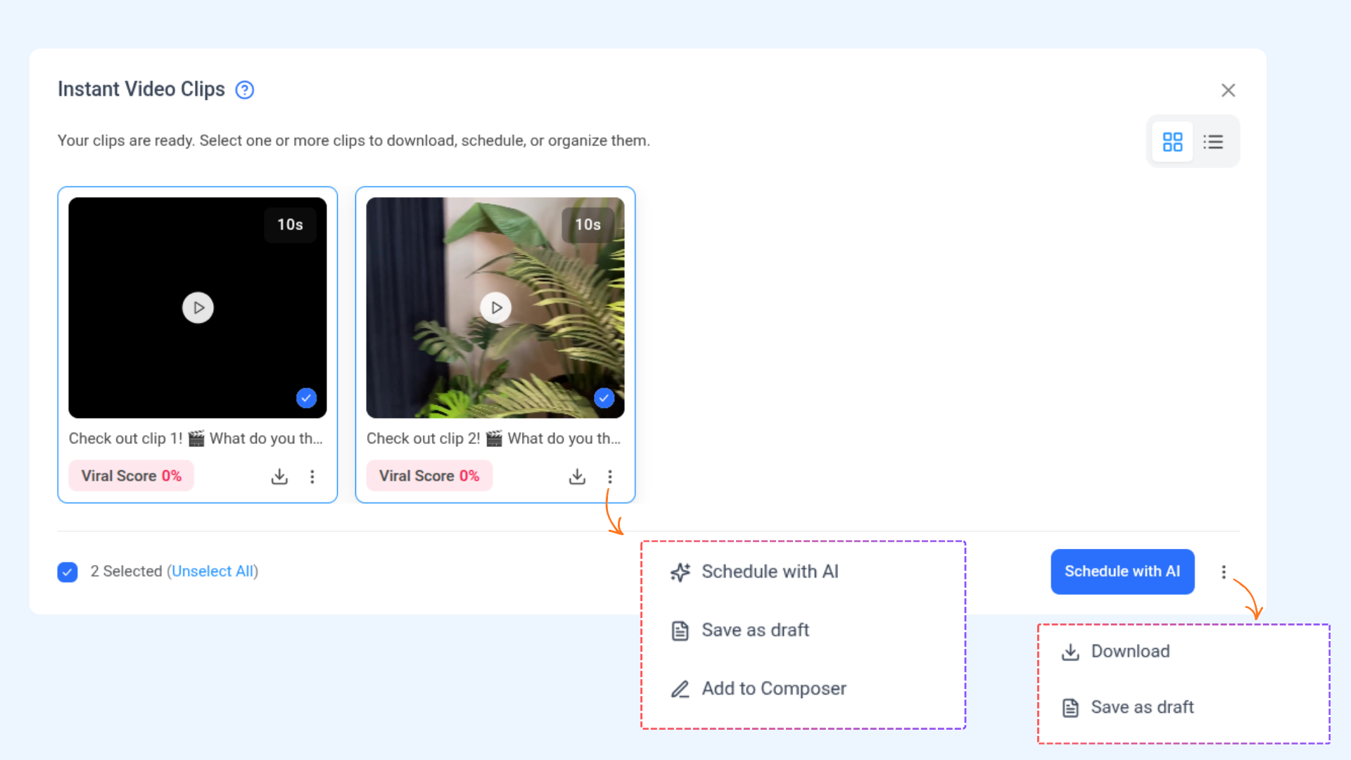 Yes. You can schedule clips individually, schedule them with AI, or save them as drafts for later use.