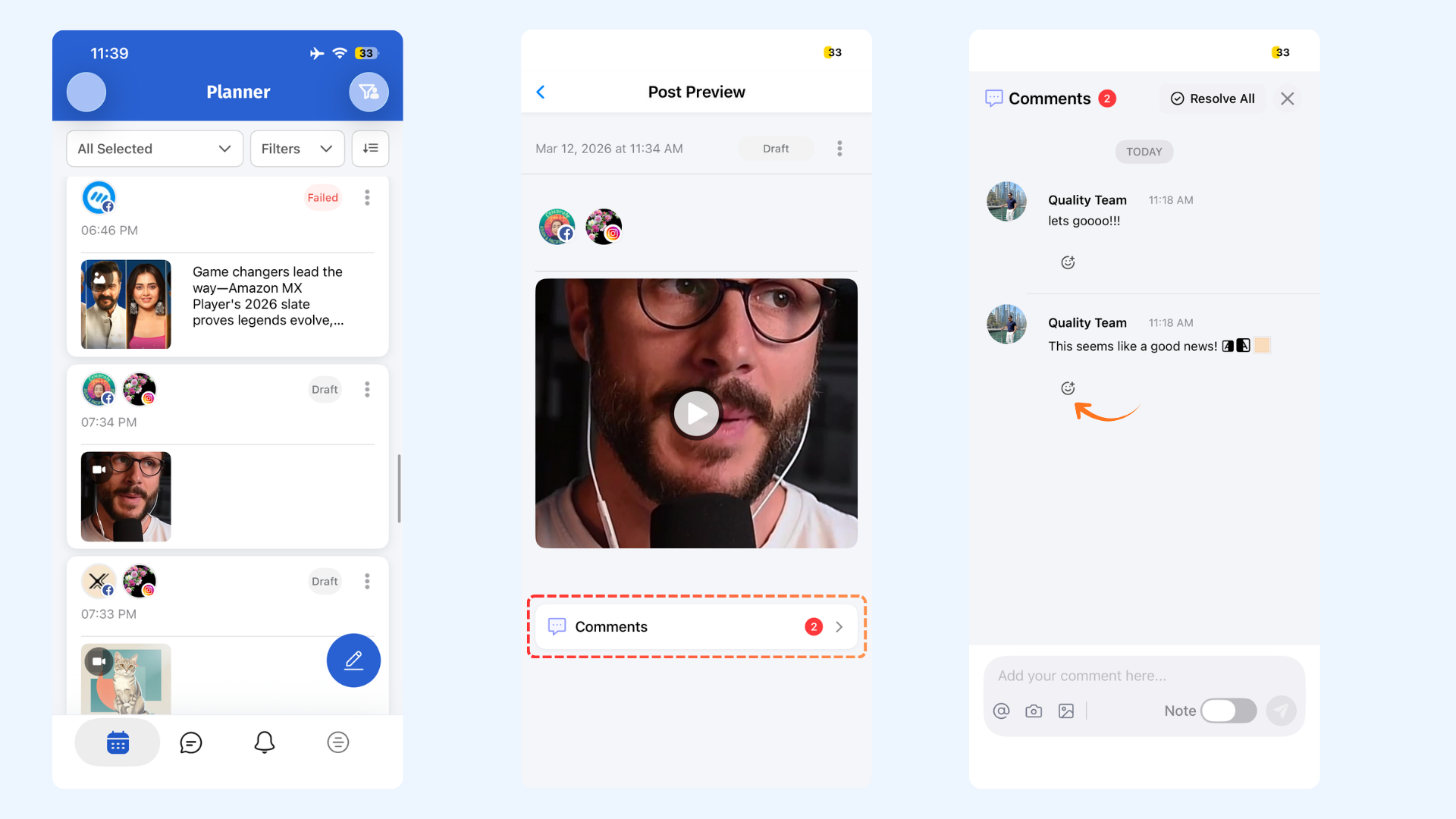 Yes. Open the post in Planner, tap Comments, then tap the emoji icon under a comment to add a reaction. Your reaction will appear instantly.
