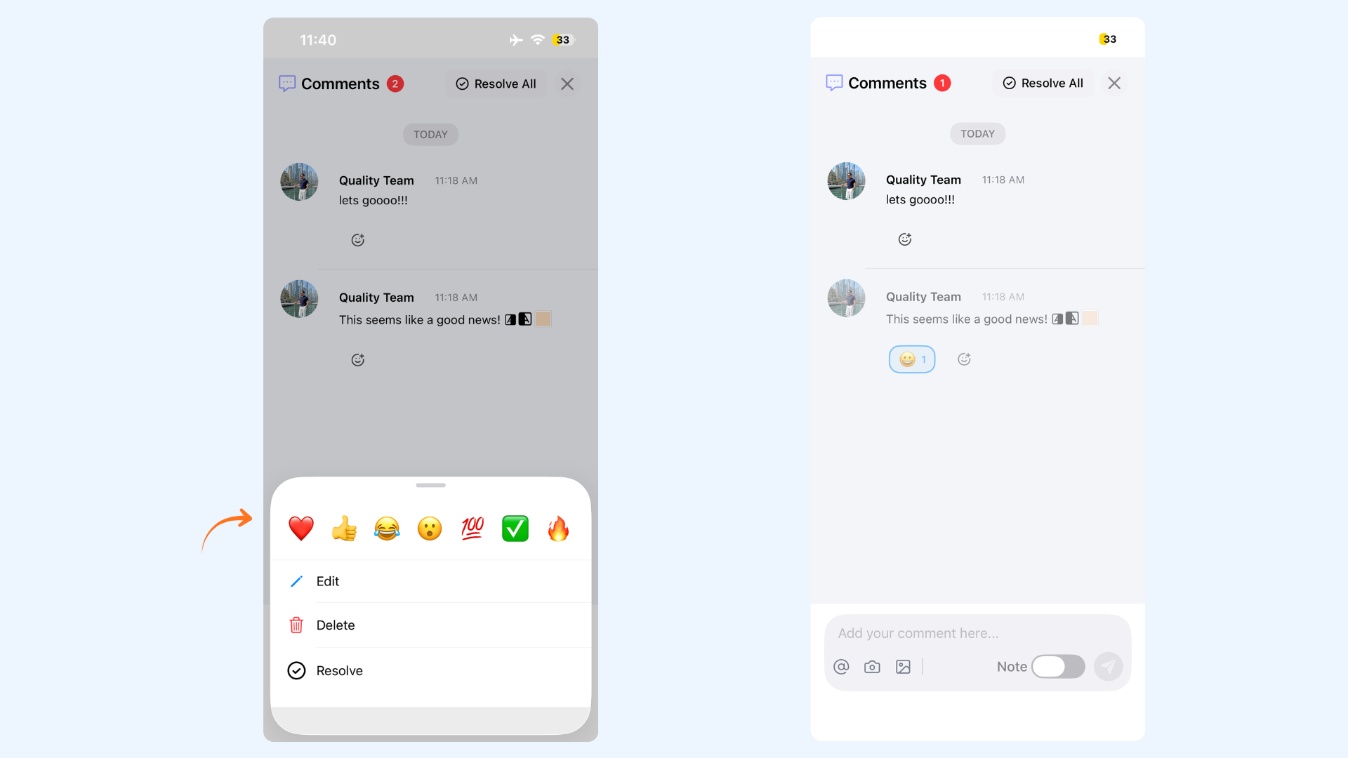 How do I resolve a comment on iOS?