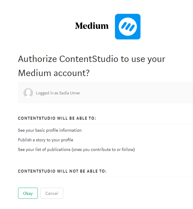 In this next step, you will be required to give ContentStudio authorization to access your medium account. Click on the Okay button to proceed further.