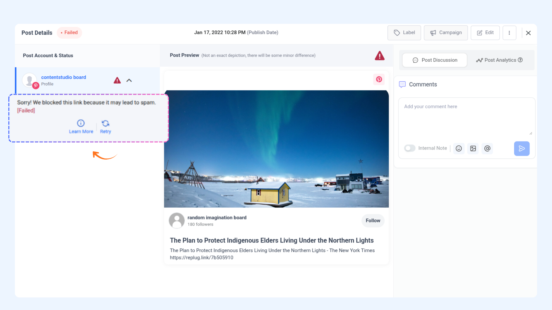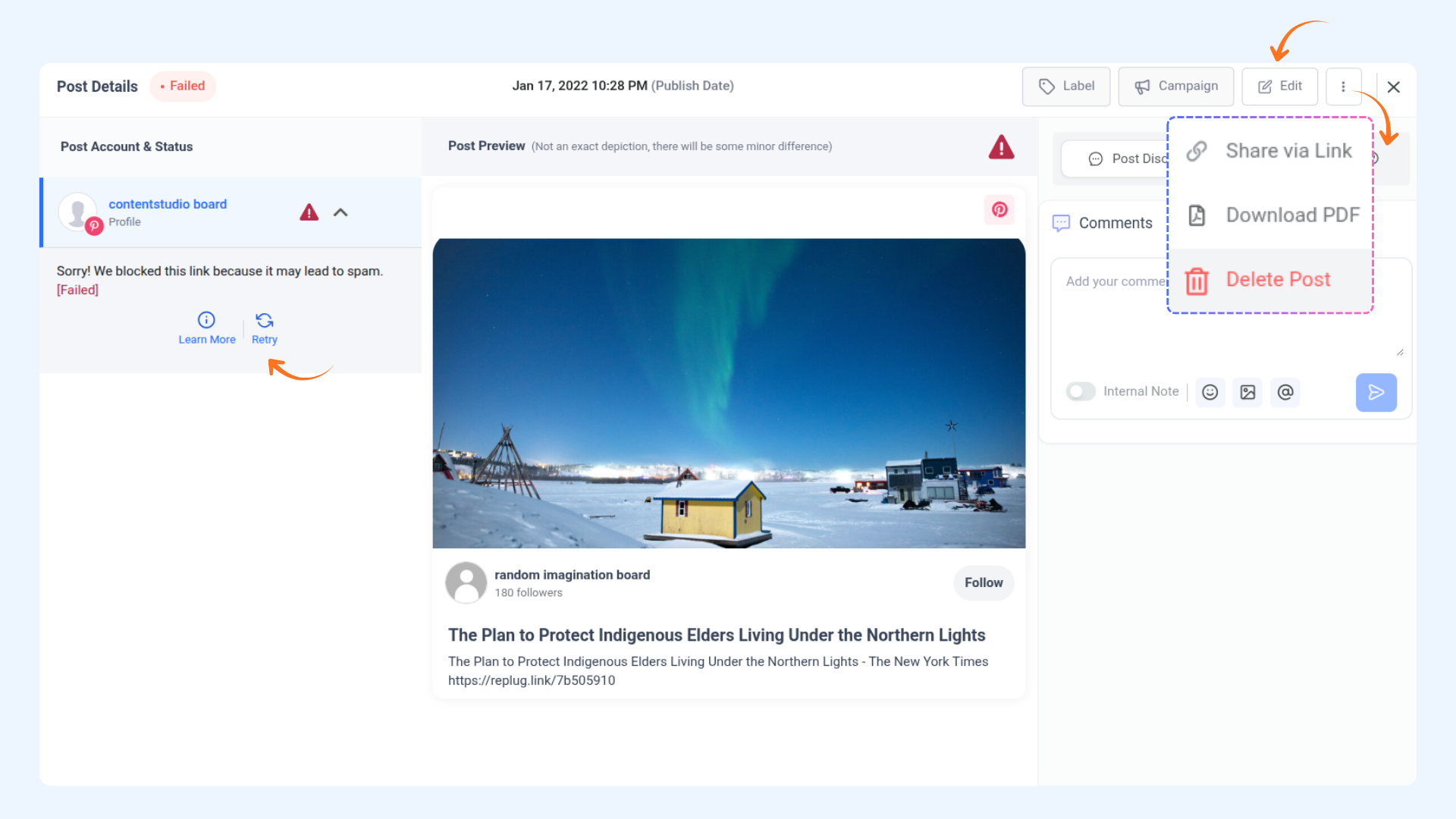 - Edit โ๏ธ โ Modify the post content if the failure was due to an issue like an invalid link, missing media, or policy violation. After editing, you can attempt to publish again.