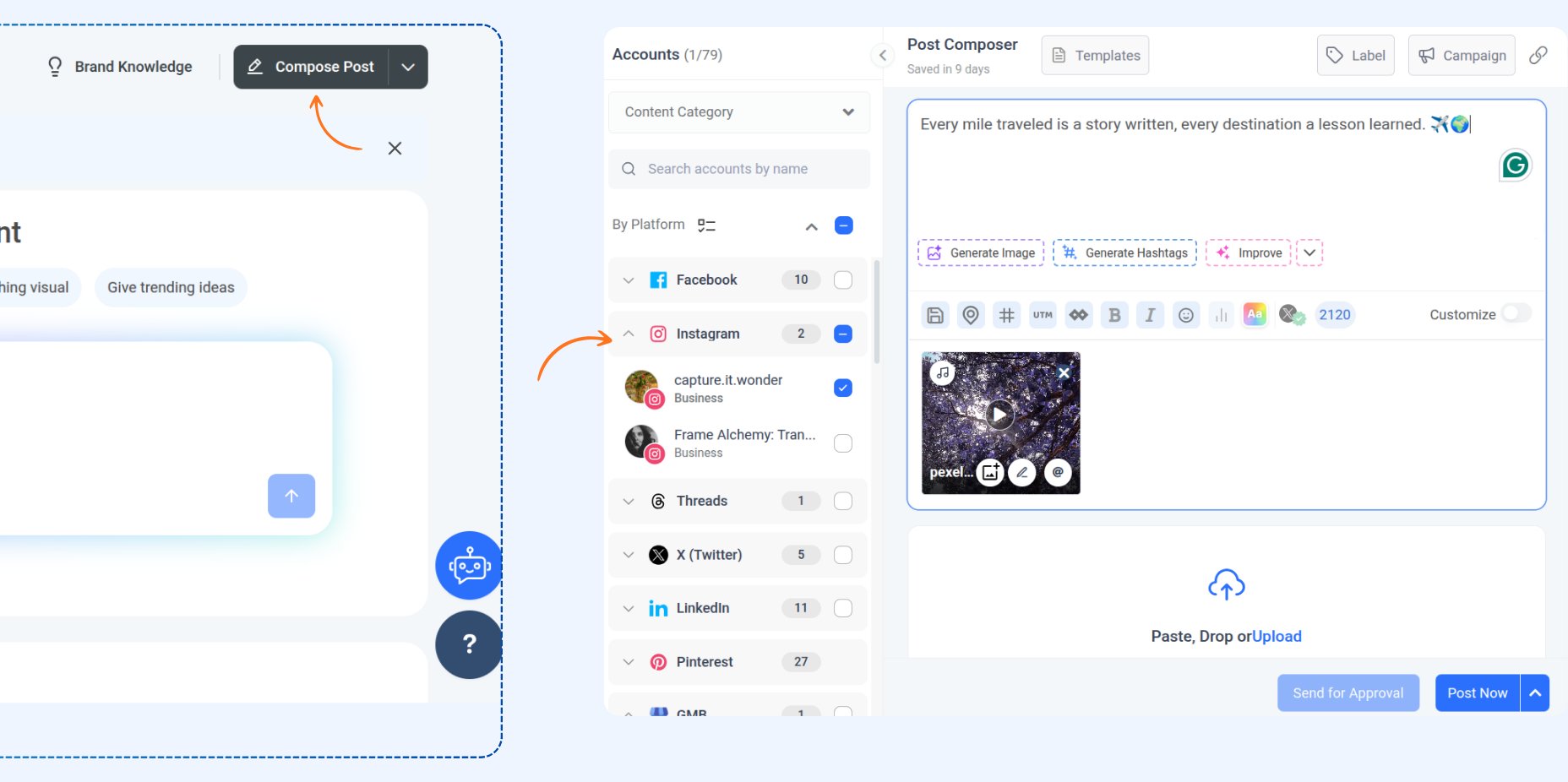 - Go to Compose → Social Post. Add your image or video, then select your Instagram account, as shown below.