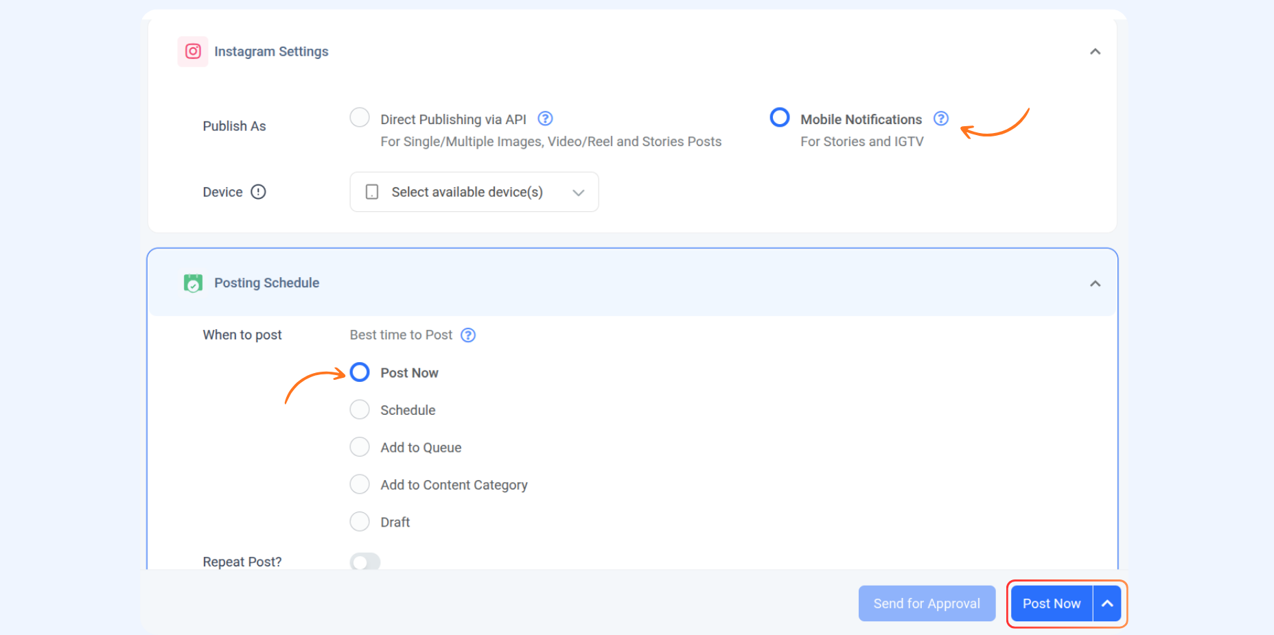- In the Instagram settings, select Mobile Notifications. Then choose to Post Now or schedule it for later.