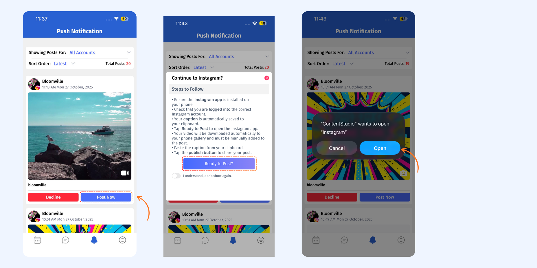 - A pop-up will appear with a disclaimer screen saying "Continue to Instagram." Tap Ready to Post, and when prompted that "ContentStudio wants to open Instagram," click Open.