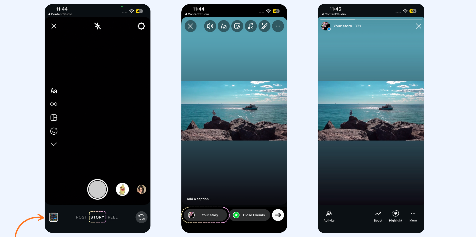 - Simultaneously posting content on Instagram: story, reel, and feed
