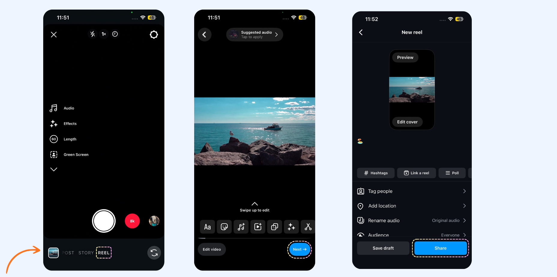 - Add your preferred sound, stickers, music, or effects, then tap Next and click Share to post your Reel.