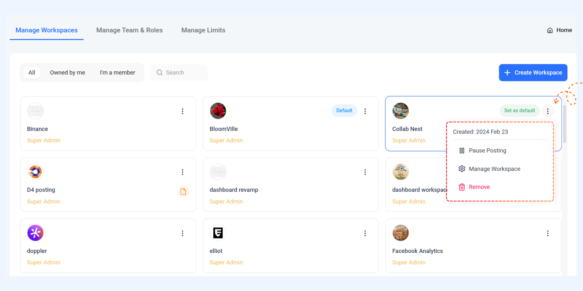 - Additionally, you’ll find a ‘Set as Default’ icon that lets you mark that workspace as your default one.