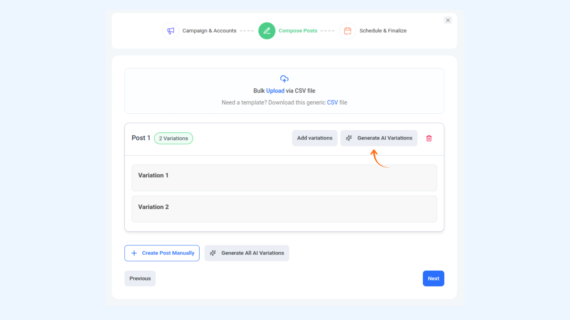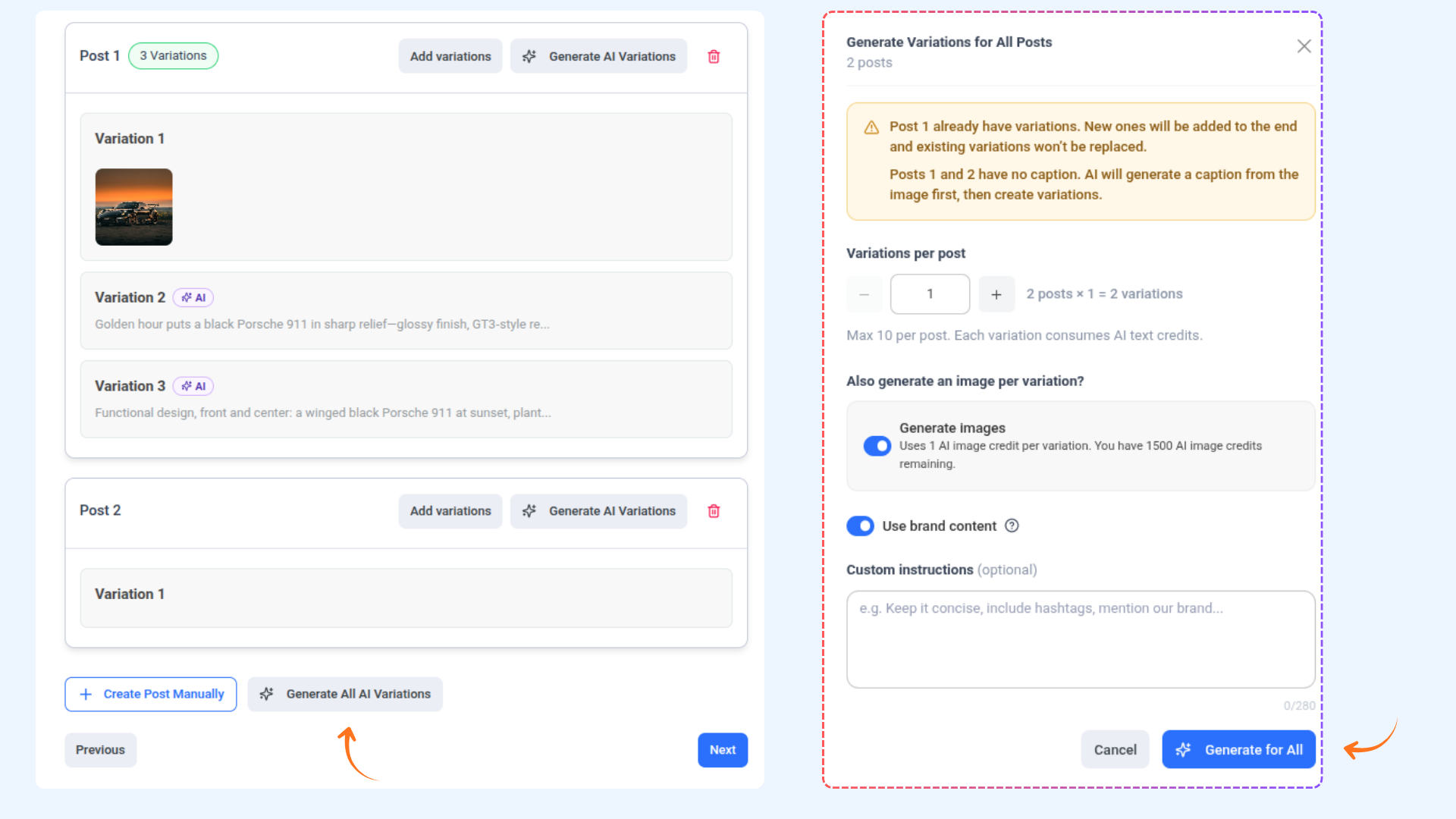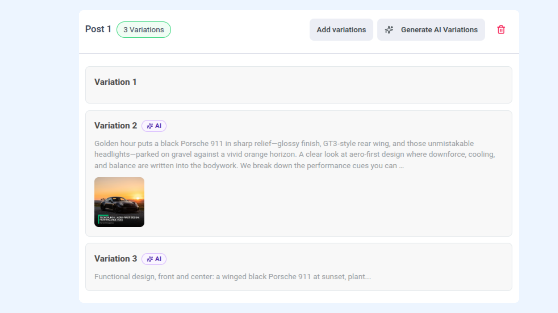 Once your posts are created, you can generate variations manually or let AI produce them automatically — either for a single post or all posts at once.