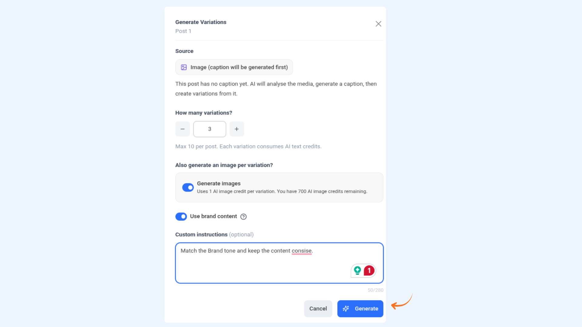 - If a post has no caption, the AI will first generate a caption based on the post image, then use that caption as the basis for creating variations.